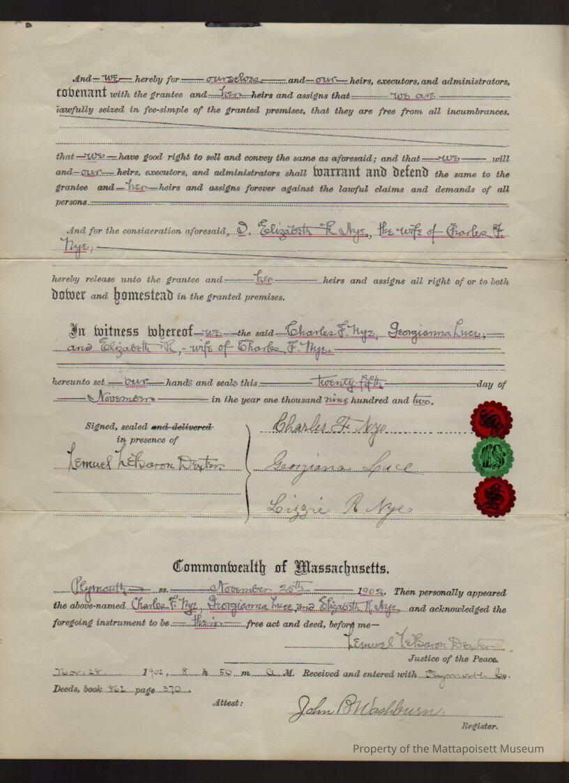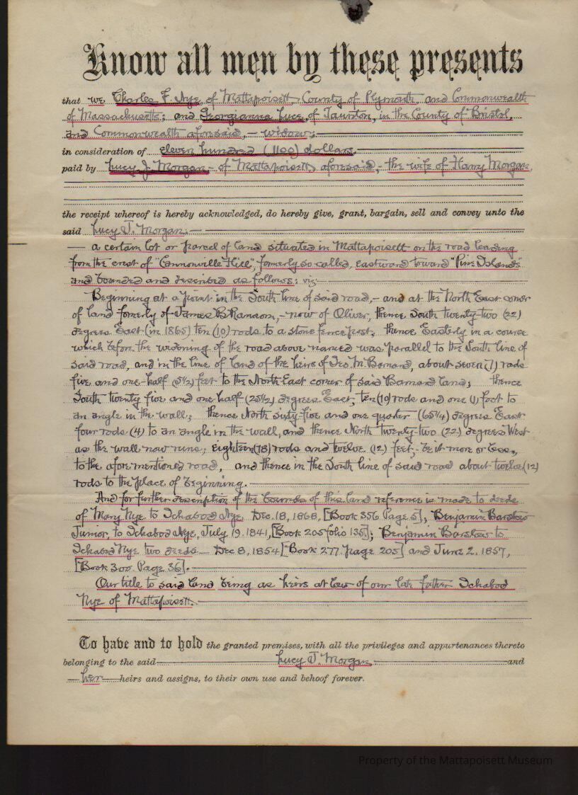 Charles F. & Elizabeth "Lizzie" R. Nye and Georgiana Luce of Tauton (widow) to Lucy J. Morgan, land on road from crest Cannonville Hill, east to Pine Islands for $1,100.Collection