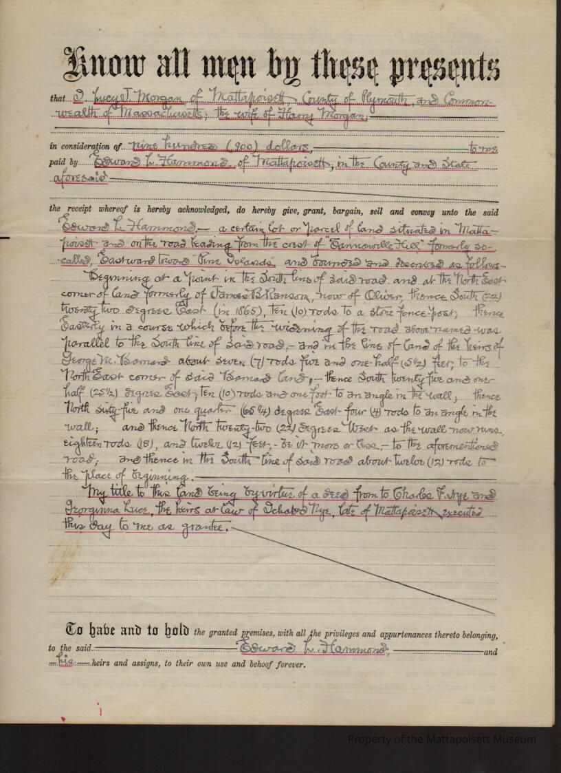 Lucy J. & Harry Morgan to Edward L. Hammond, land on the road from the crest of Cannonville Hill east toward Pine Island for $900.Collection