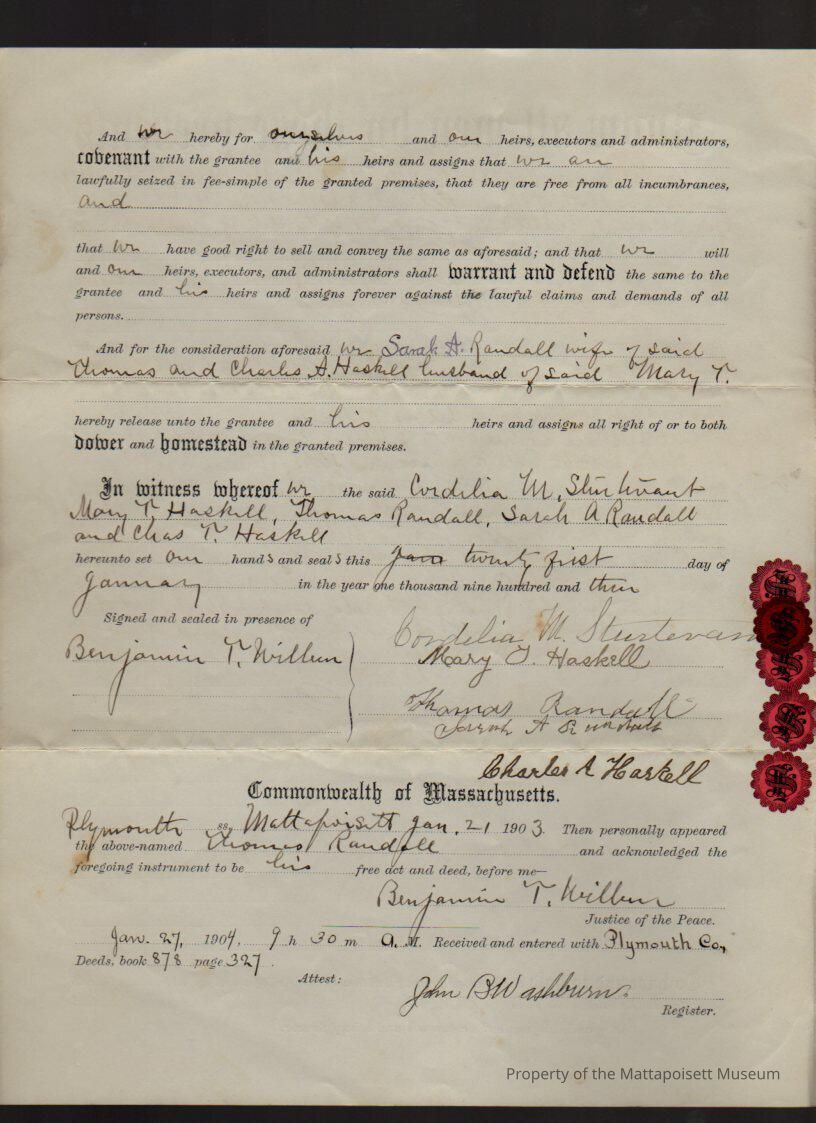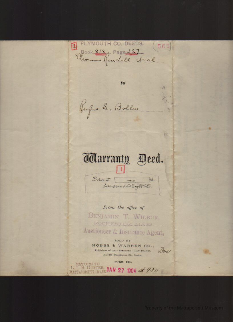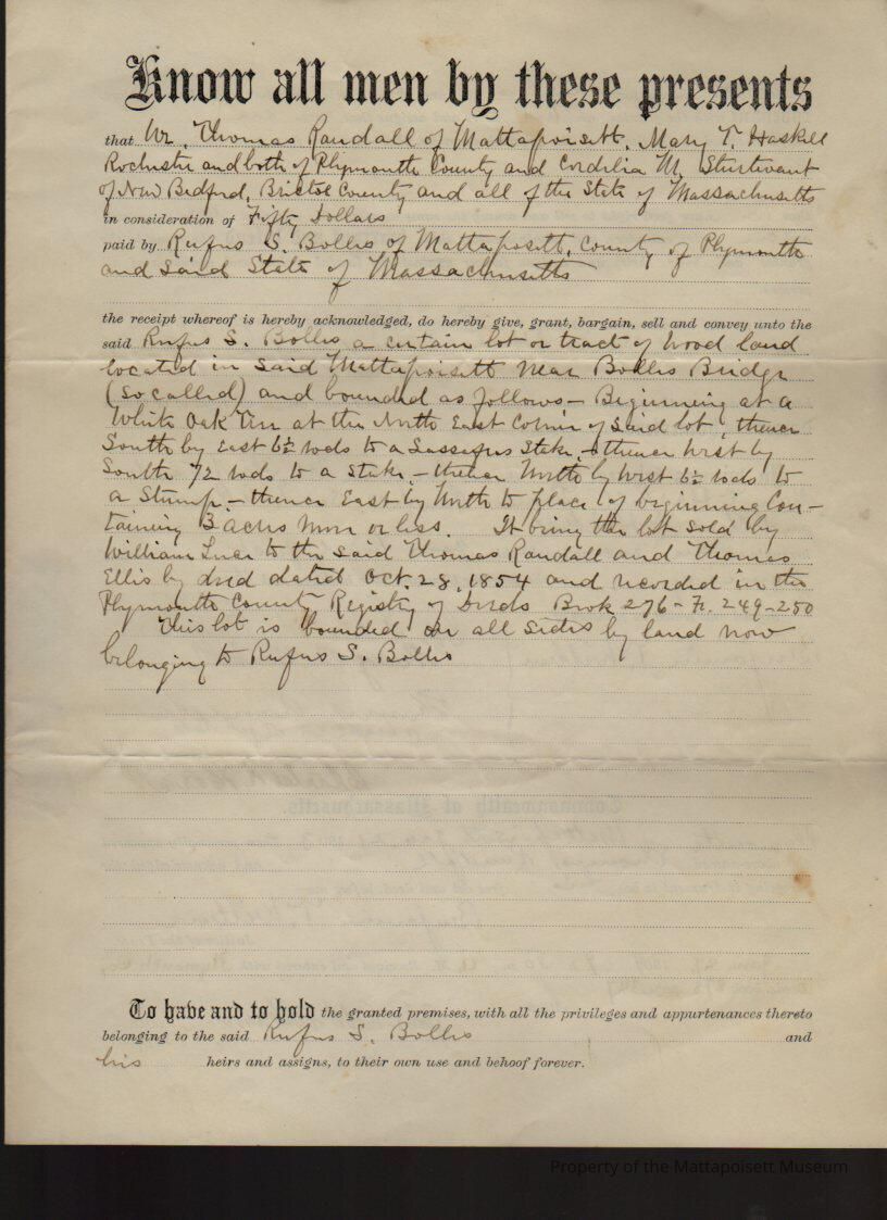 Cordilia M. Sturtevant, Mary T. & Charles A. Haskell, Thomas & Sarah A. Randall to Rufus S. Bolles, 3 acres woodland near Bolles Bridge for $50.Collection