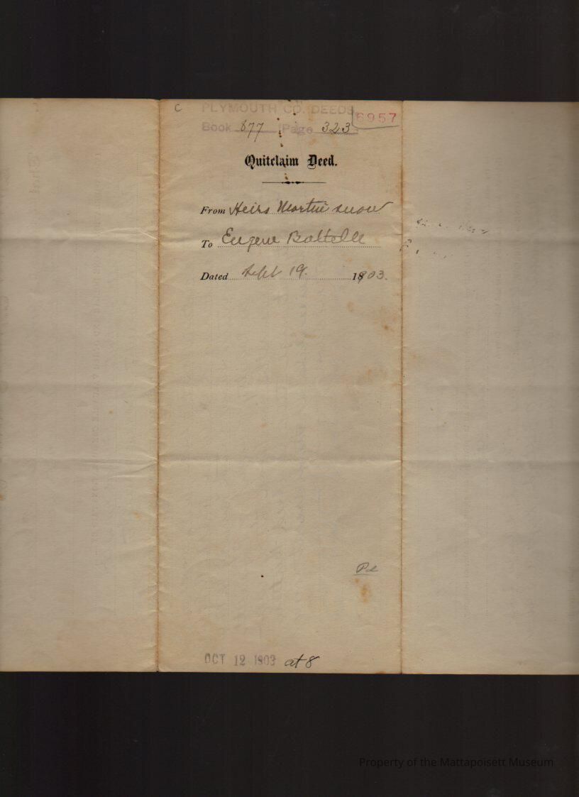 Heirs of Martin Snow (Annie D. Gifford, Edgar B. Gifford, Louella T. Ede, James Ede, Lizzie A. S. Ames, Frank C. Ames, Everett A. Snow, Silas W. Snow) to Eugene Battelle of Boston, woodland for $1 and other valuable considerations.Collection