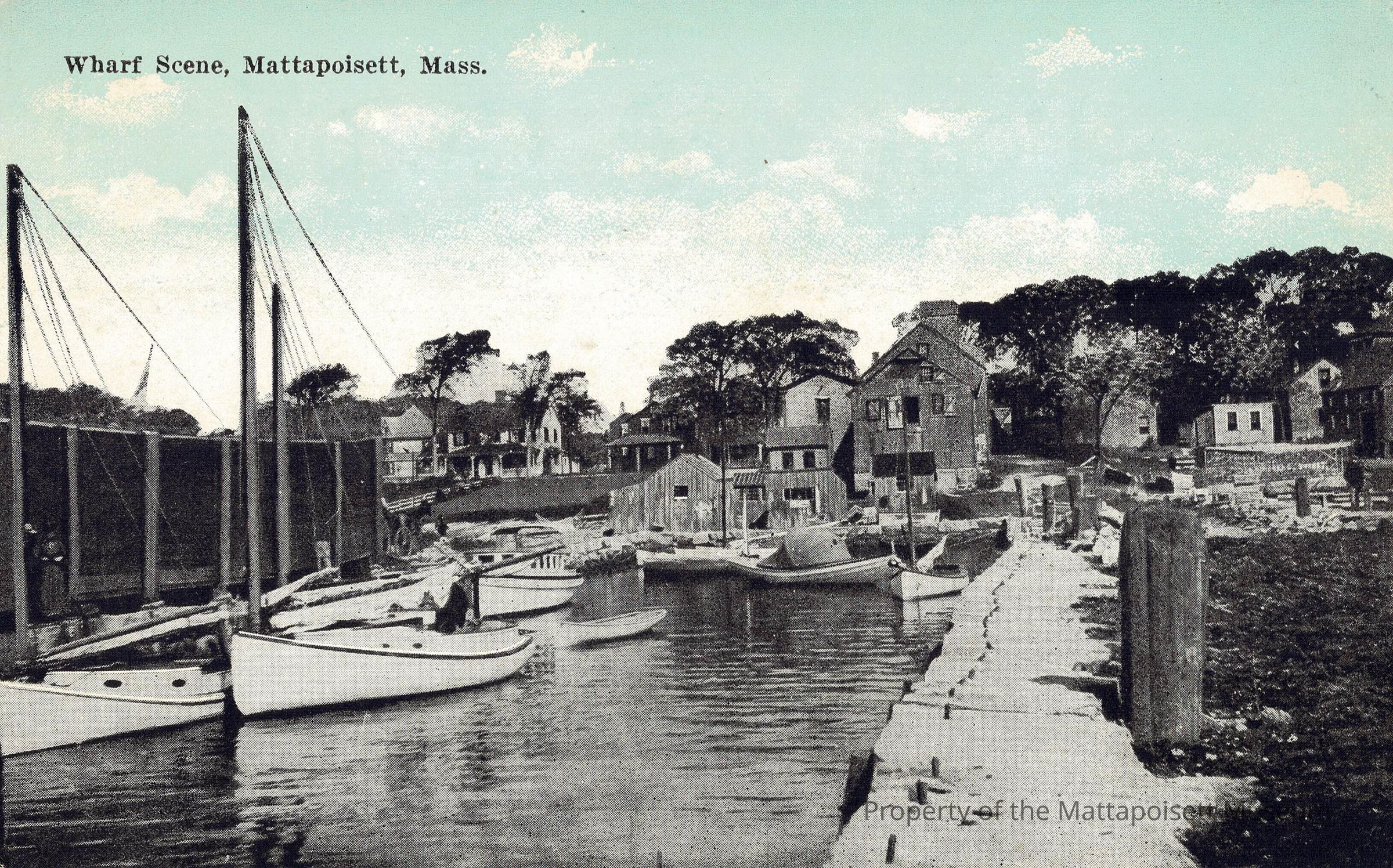 Hand-colored postcard showing Wharf Scene, Mattapoisett, Mass. Hand-written note on reverse.Collection