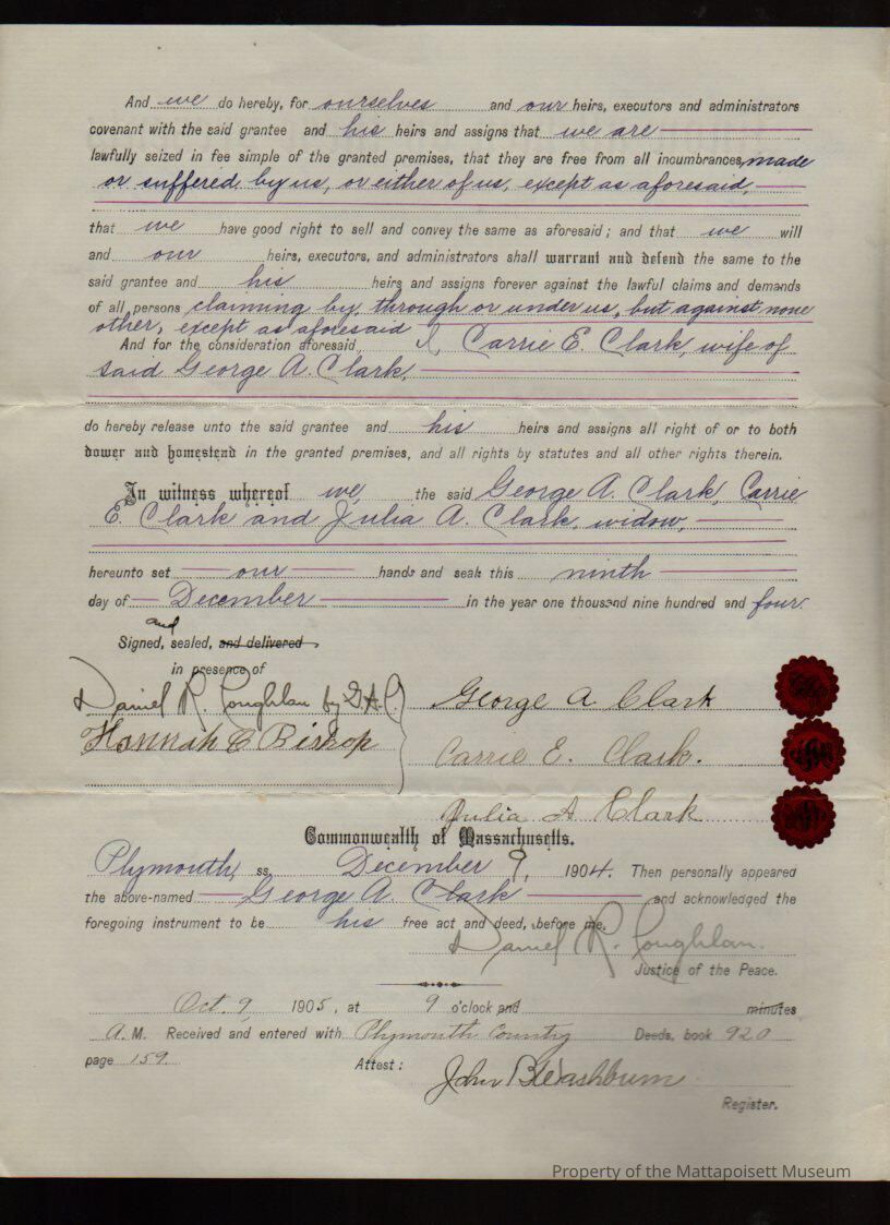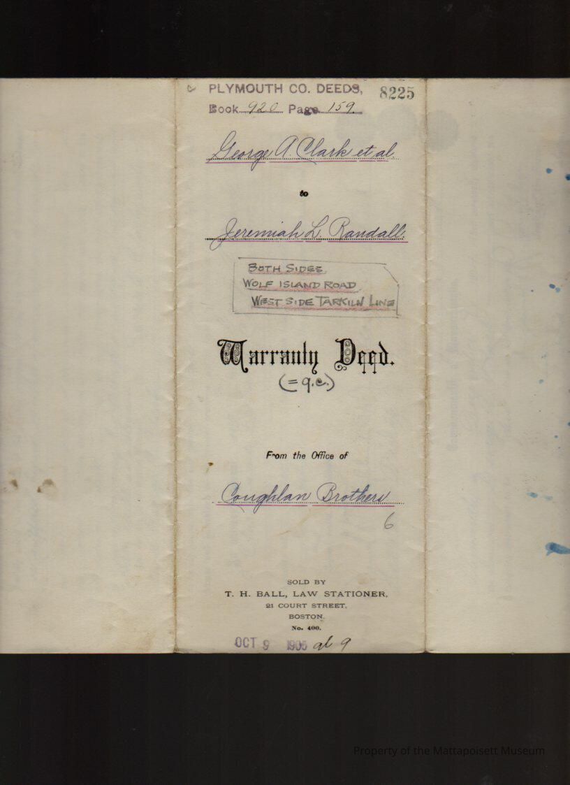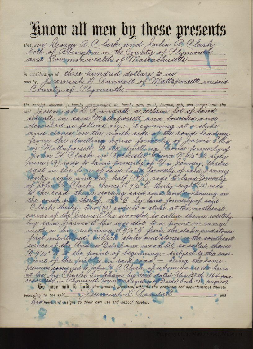 George A. & Carrie E Clark and Julia A. Clark (widow) all of Abington to Jerimiah L. Randall, land on either side of Wolf Island Road for $300.Collection