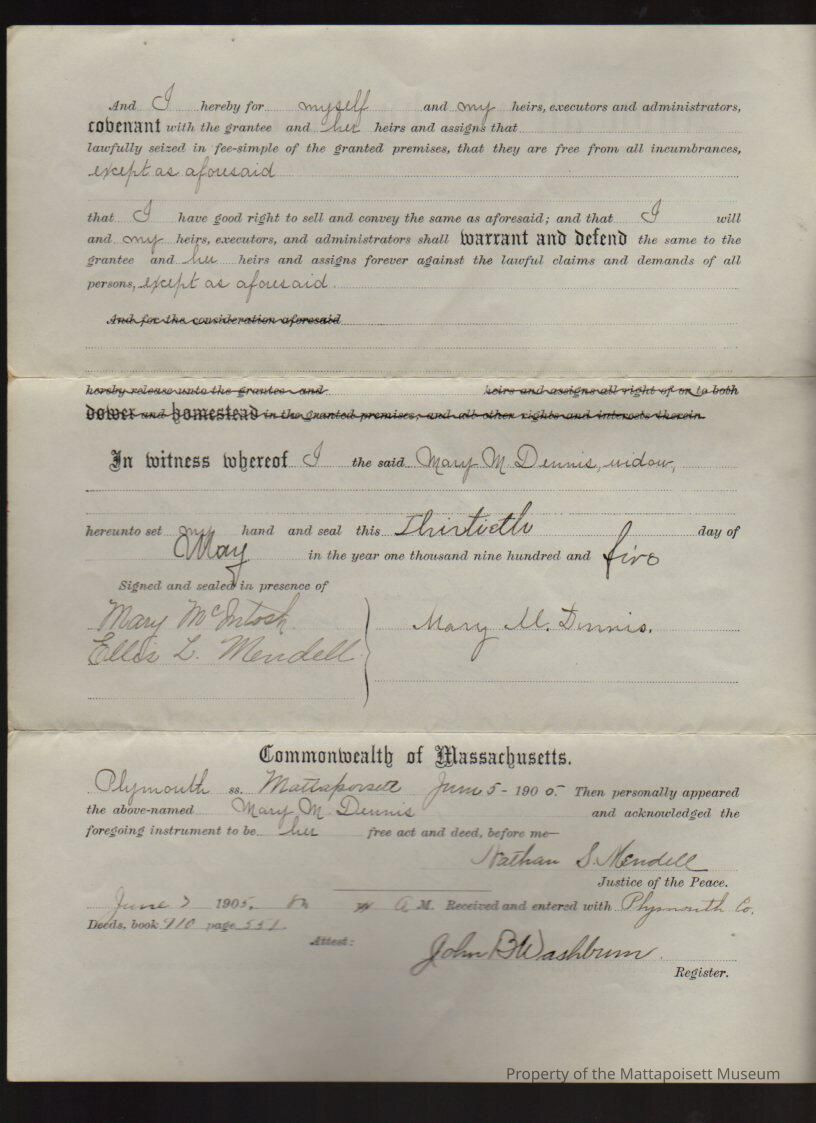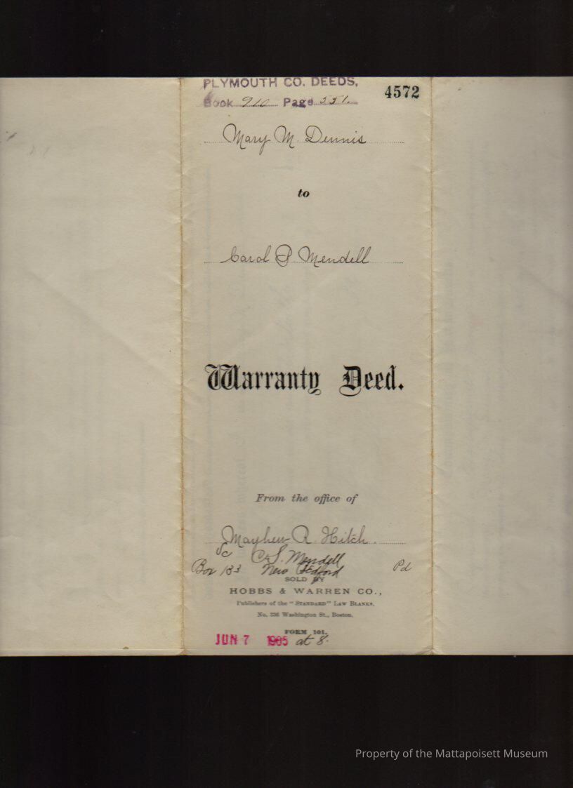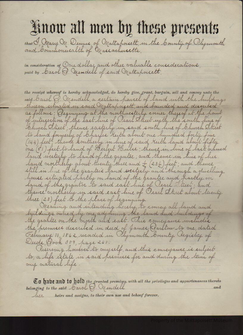 Mary M. Dennis (widow) to Carol P. Mendell, land and buildings on Pearl and Church Streets for $1 and other valuable considerations.Collection