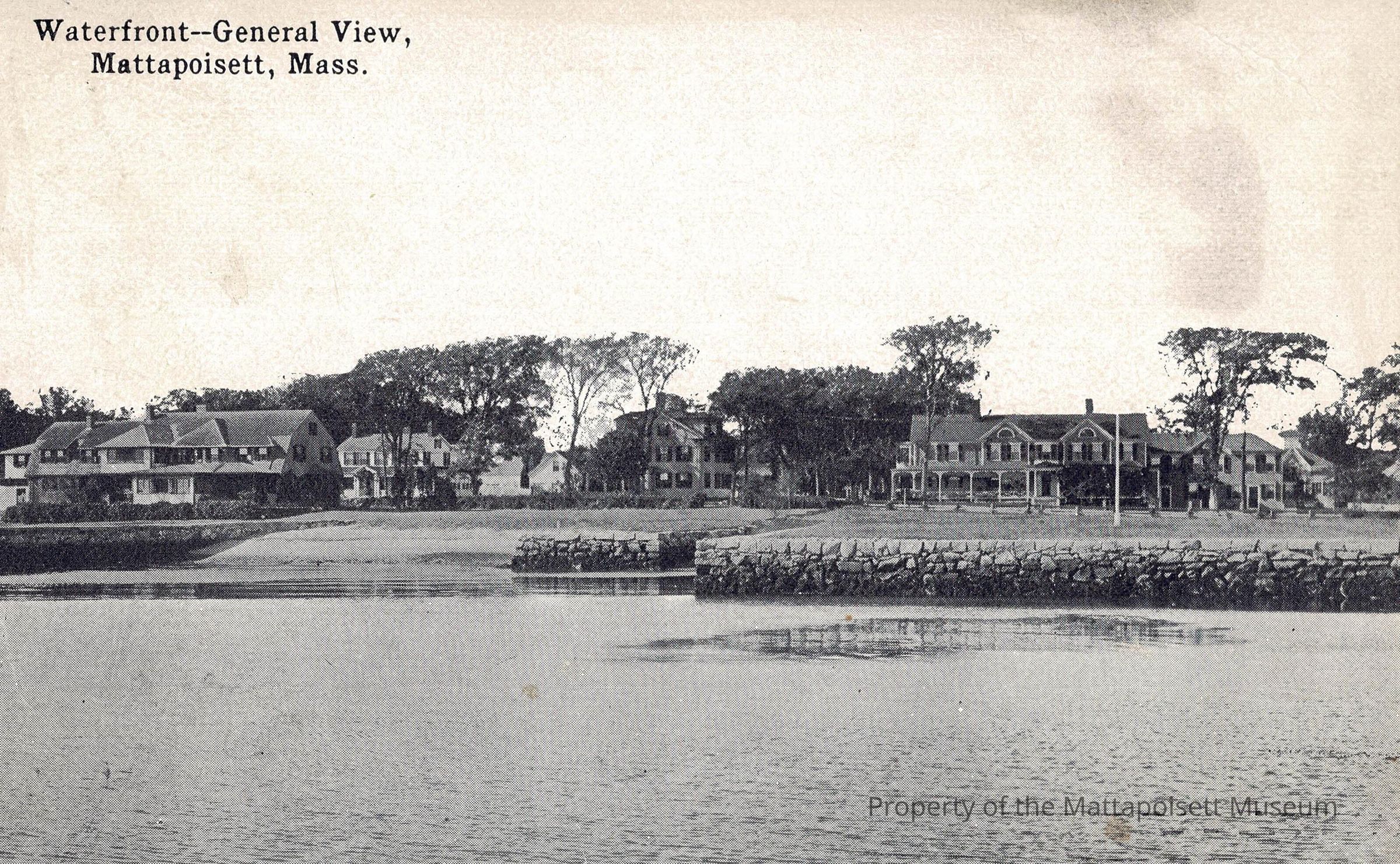 Black and white postcard showing Waterfront -- General View, Mattapoisett, Mass. Pre-address Alice C. Ordway, North Street, Mattapoisett, Massachusetts.Collection