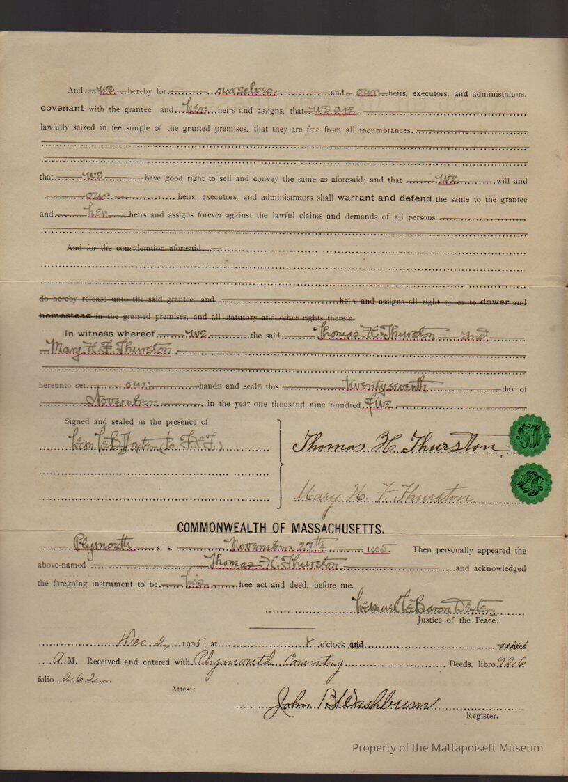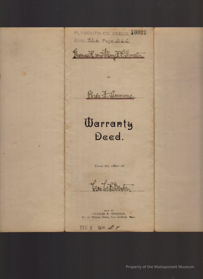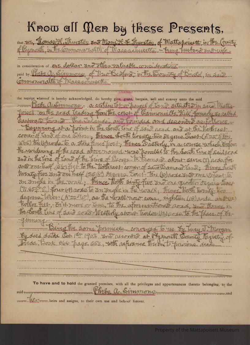 Thomas H. & Mary H. Thurston to Phebe A. Simmons of New Bedford, land on the road leading from the crest of Cannonville Hill eastward toward Pine Islands for $1 and other valuable considerations.Collection