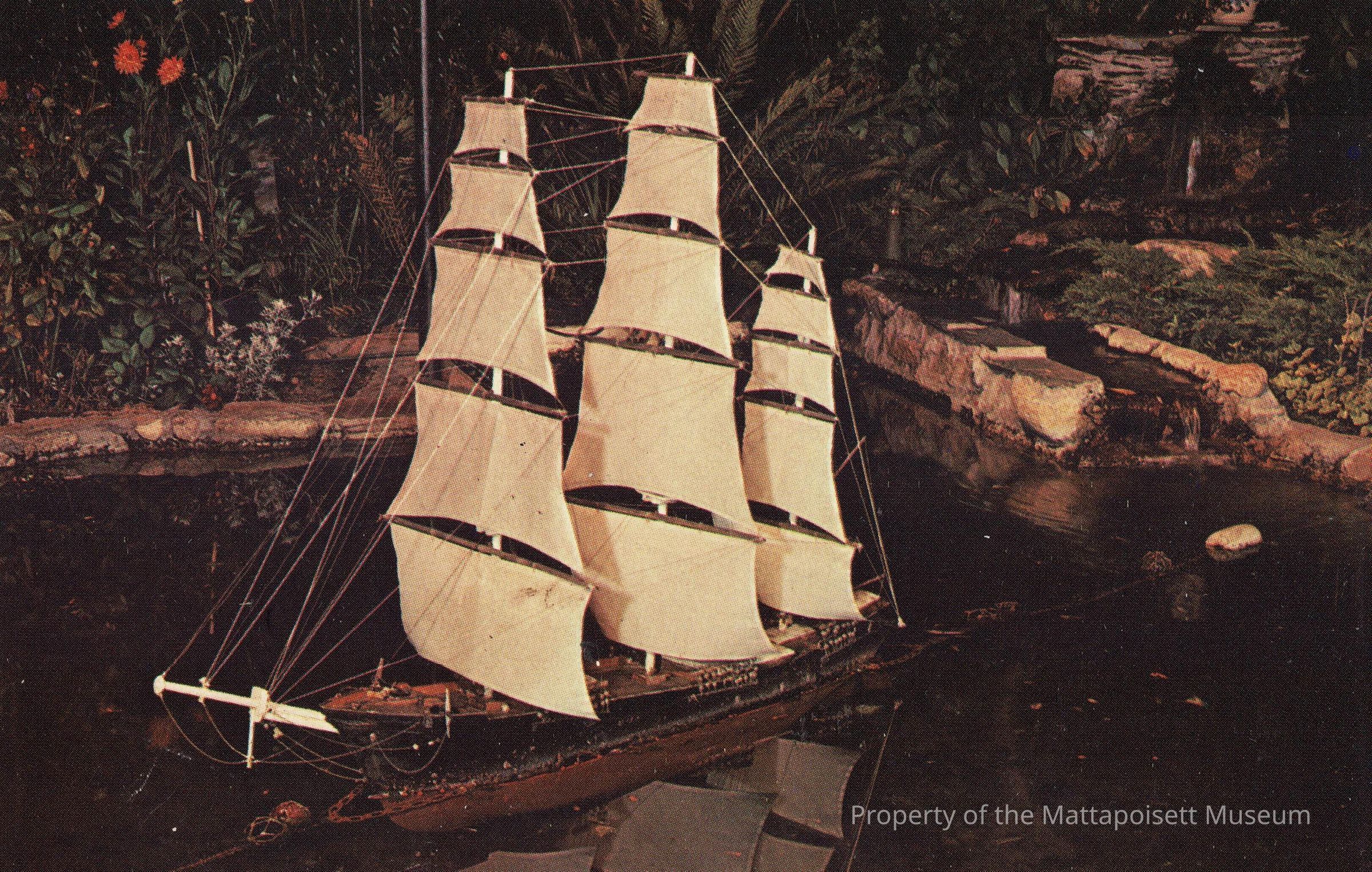 Colored picture postcard showing a small model Clipper Ship afloat ont he pond at the Pleasant View Gift Shop, Route 6, Mattapoisett, Massachusetts.Collection