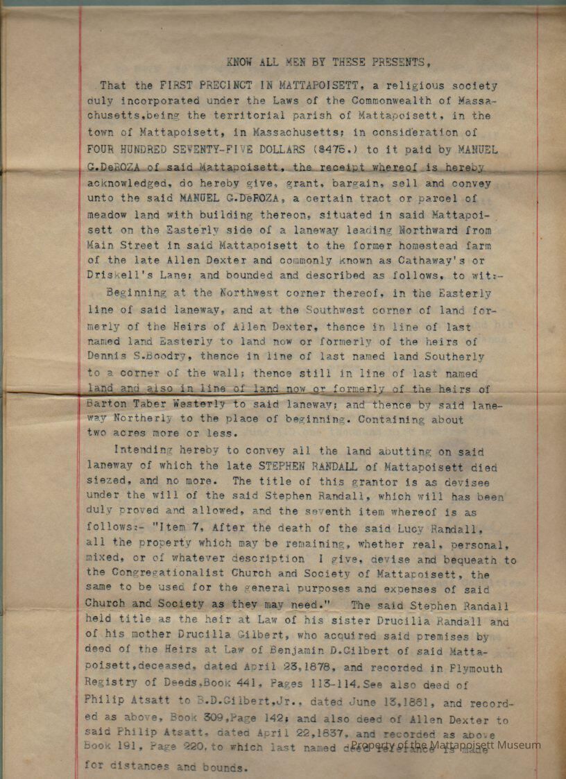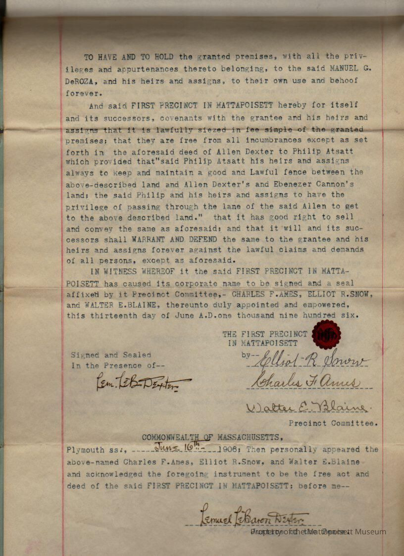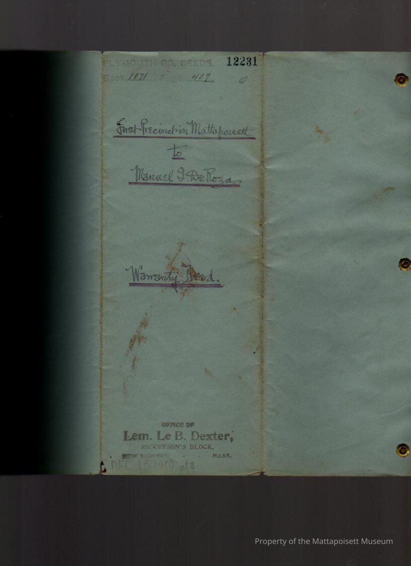 Elliot R. Snow, Charles F. Ames and Walter E. Blaine, Precinct Committee for the First Precinct of Mattapoisett, to Manuel G. DeRoza, meadow land and building on the easterly side of laneway leading north from Main Street for $475.Collection