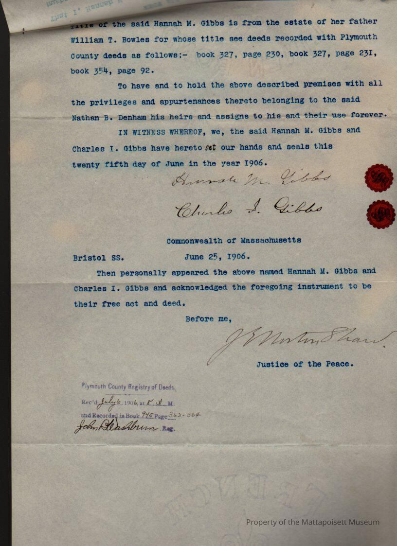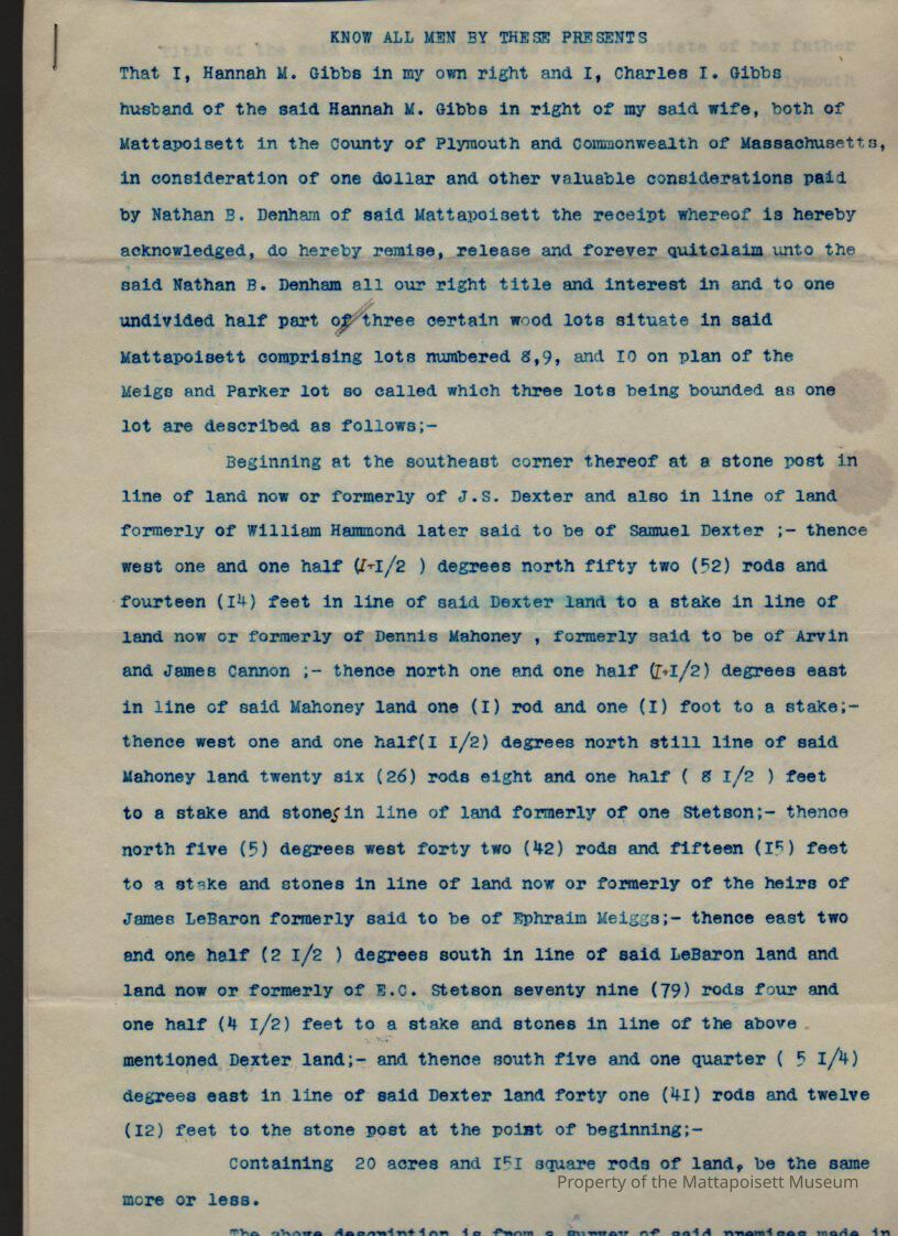 Hannah M. & Charles I. Gibbs to Nathan B. Denham, 20 acres, 151 square rods of land for $1 and other valuable considerations.Collection