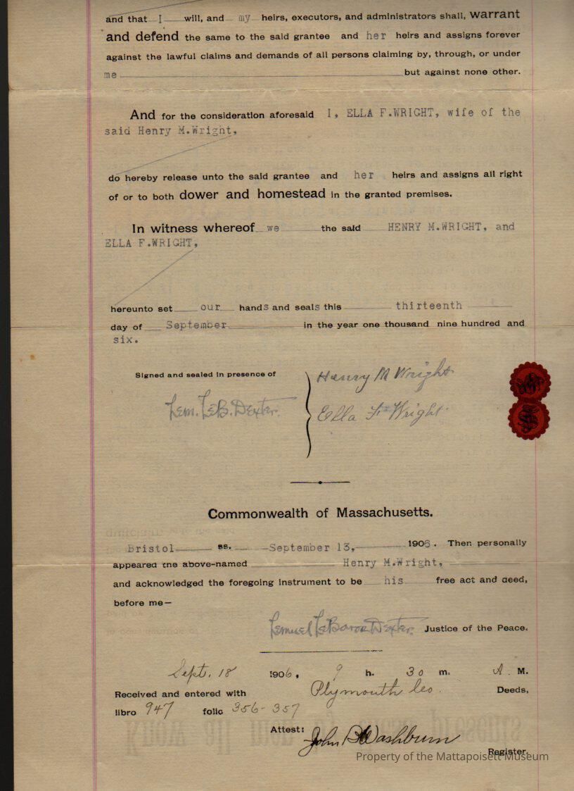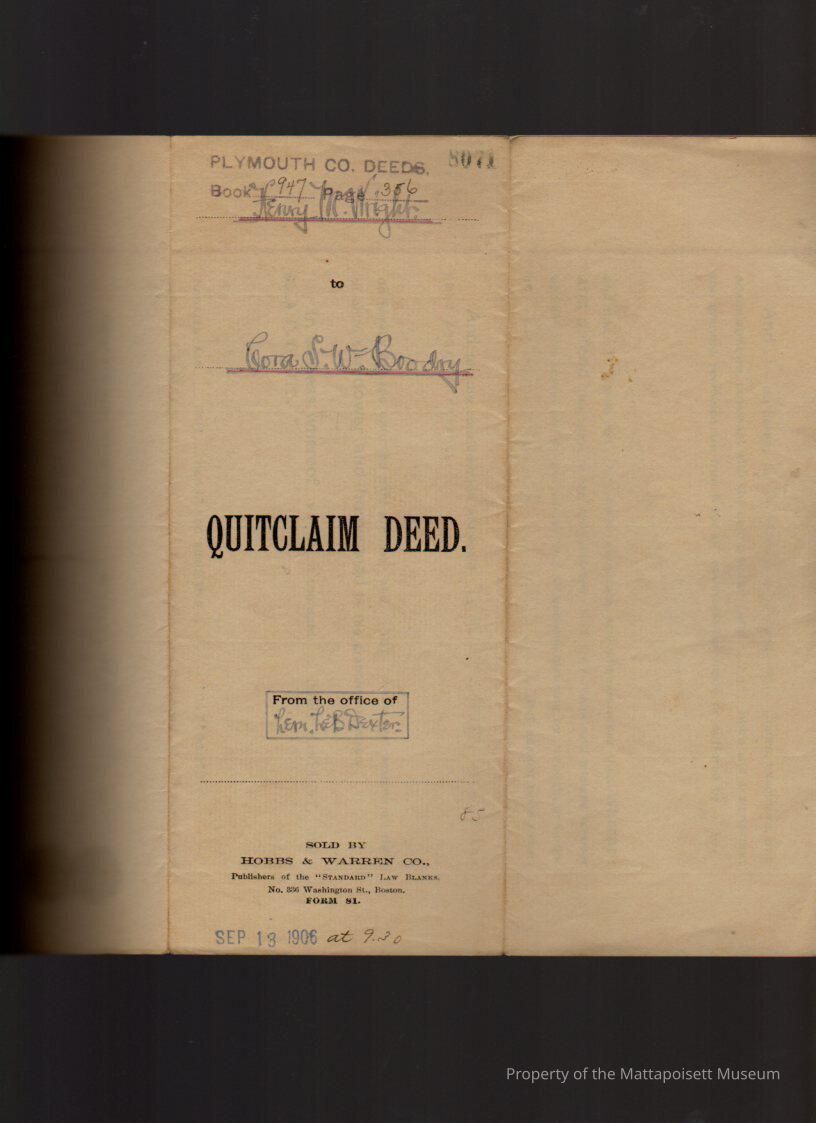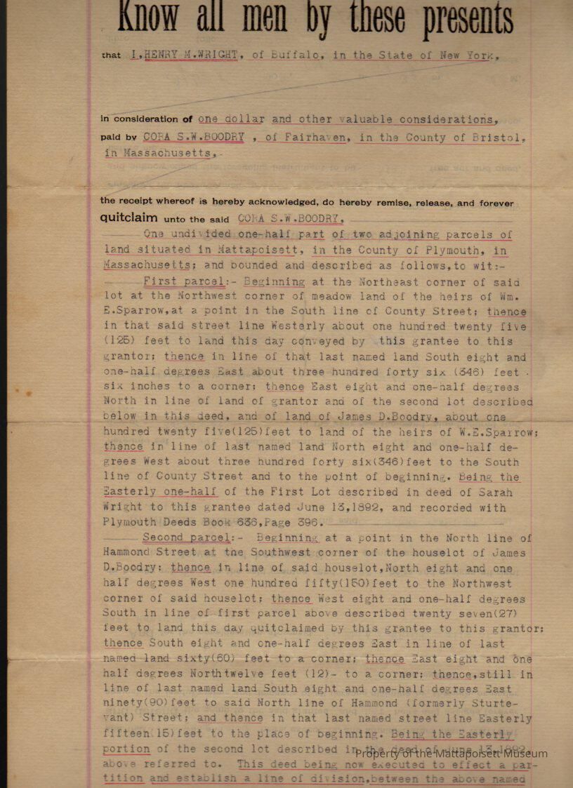 Henry M. Wright to Cora S. W. Boodry, one-half part of two parcels of land, one at the intersection of east side of Barstow Street and south line of County Street, the second on the north line of Hammond Street for $1 and other valuable considerations.Collection
