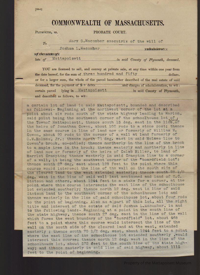 Mary G. Macomber, executrix of the will of Joshua L. Macomber, land sold for $350.Collection