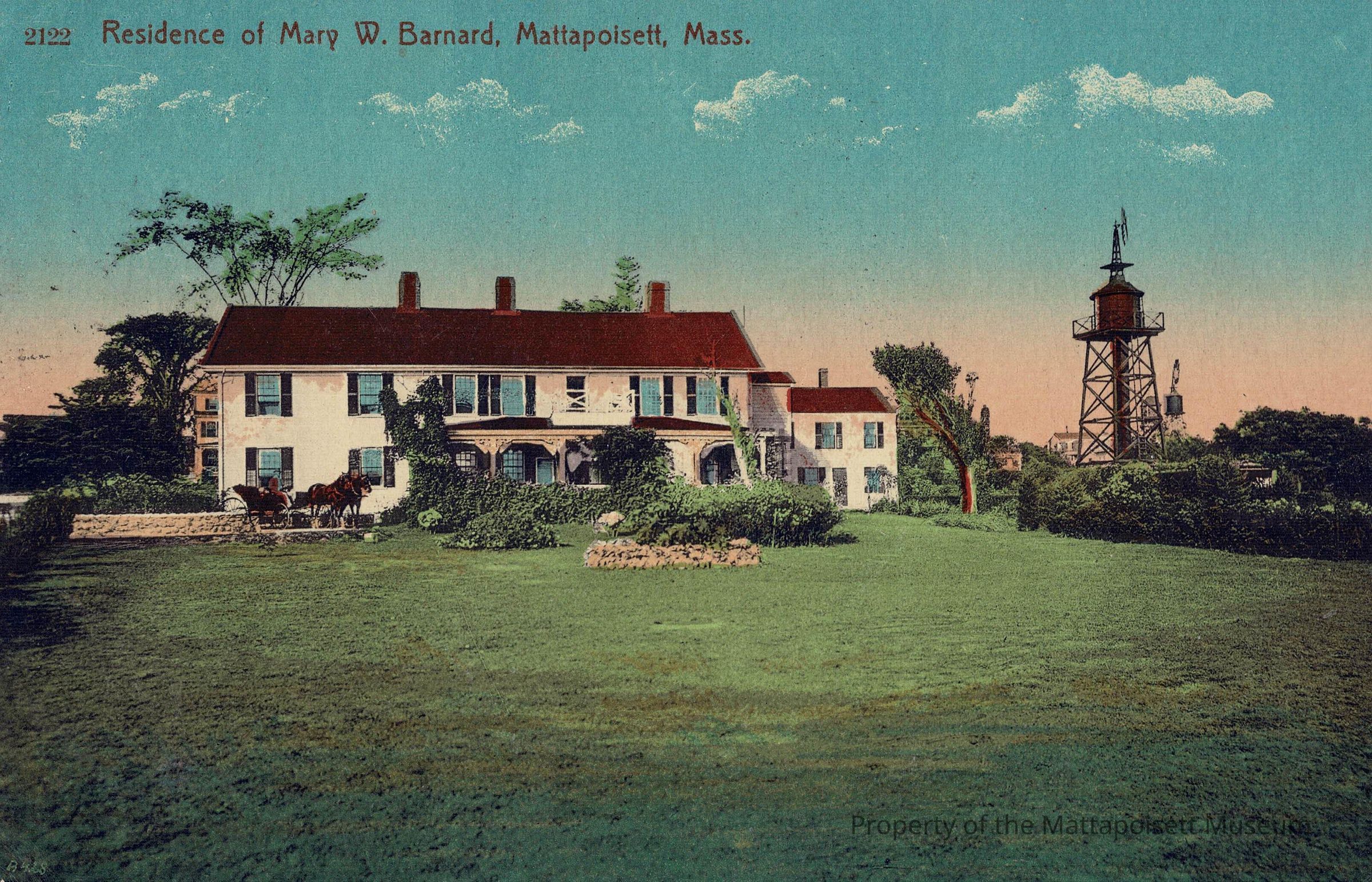 Hand-colored postcard showing Residence of Mary W. Barnard, Mattapoisett, Mass. Hand-written note from Lillian to Mrs. Clarence Valentine, E. Hartley, Mass. Postmarked on September 9, 1911 from Marion, Mass.Collection