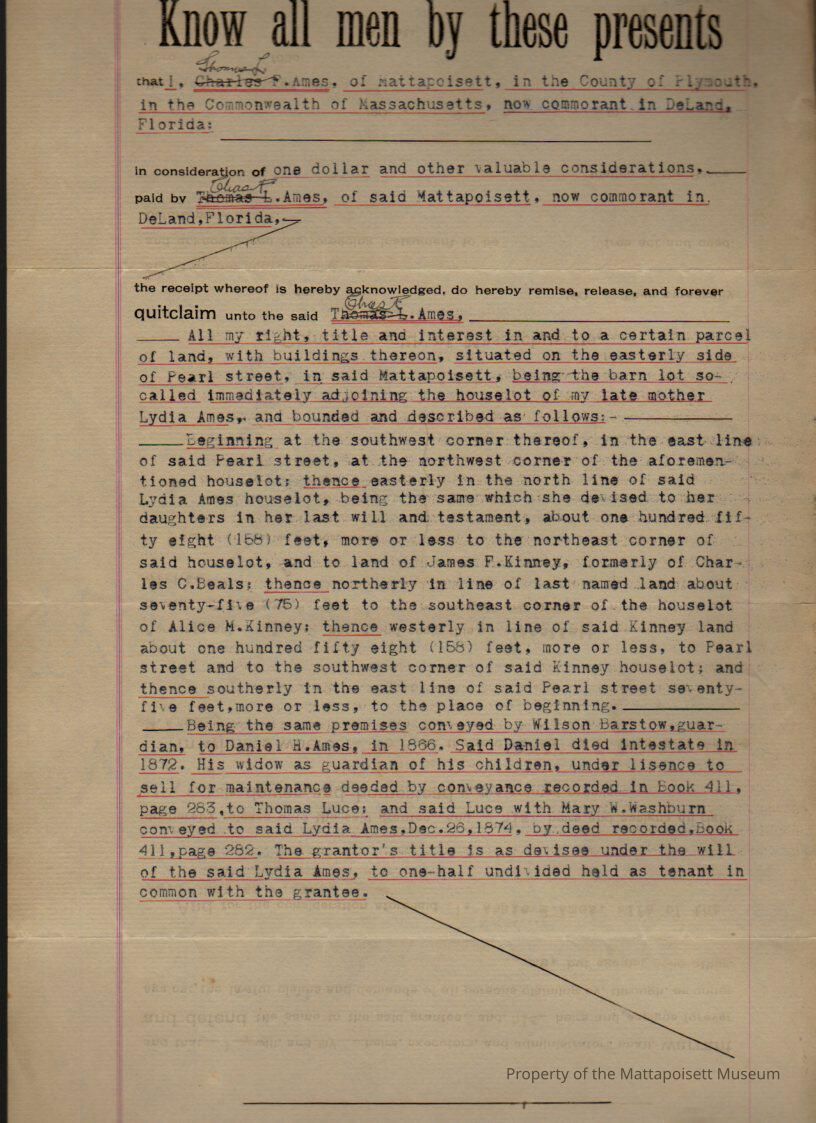 Thomas L. & Helen B. Ames to Charles F. Ames, both of DeLand FL, land and buildings on the east side of Pearl Street for $1 and other valuable considerations.Collection