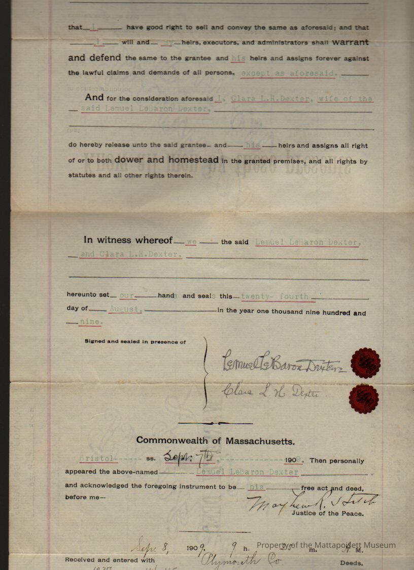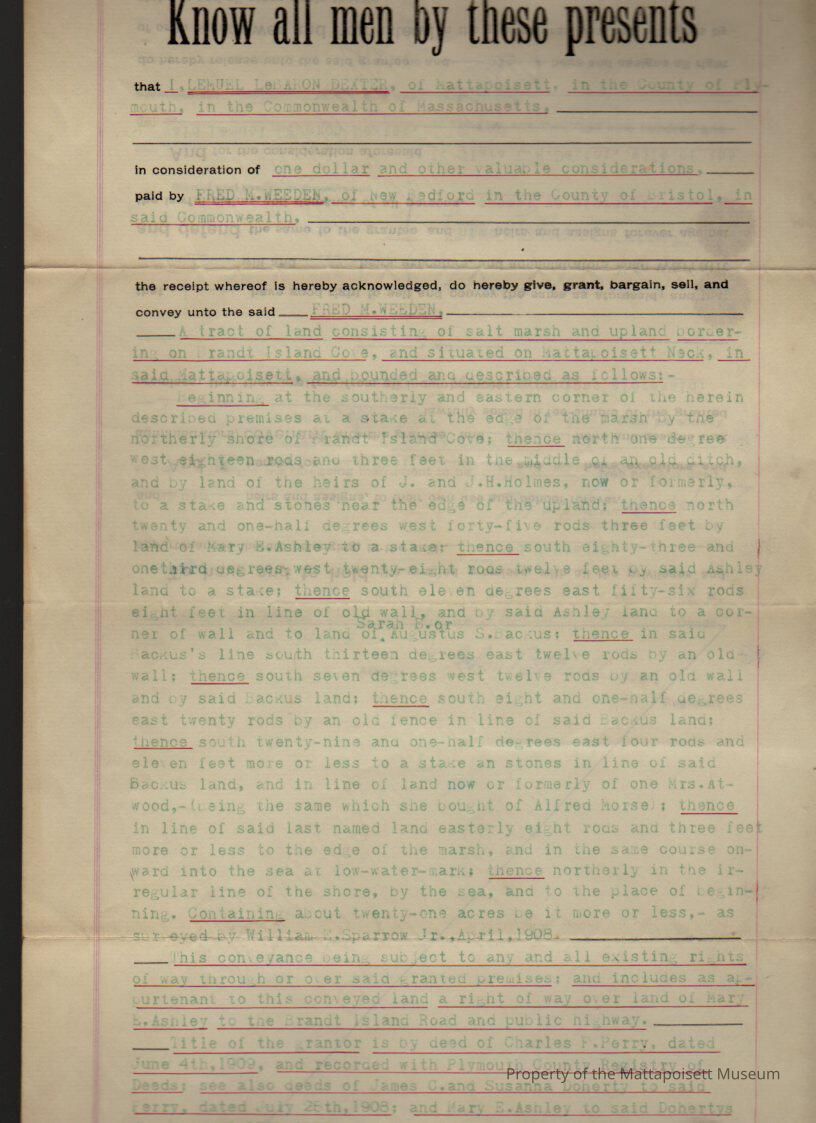 Lemuel LeBaron & Clara L. H. Dexter to Fred H. Weeden, land of salt marsh and upland bordering on Brandt Island Cove for $1 and other valuable considerations.Collection