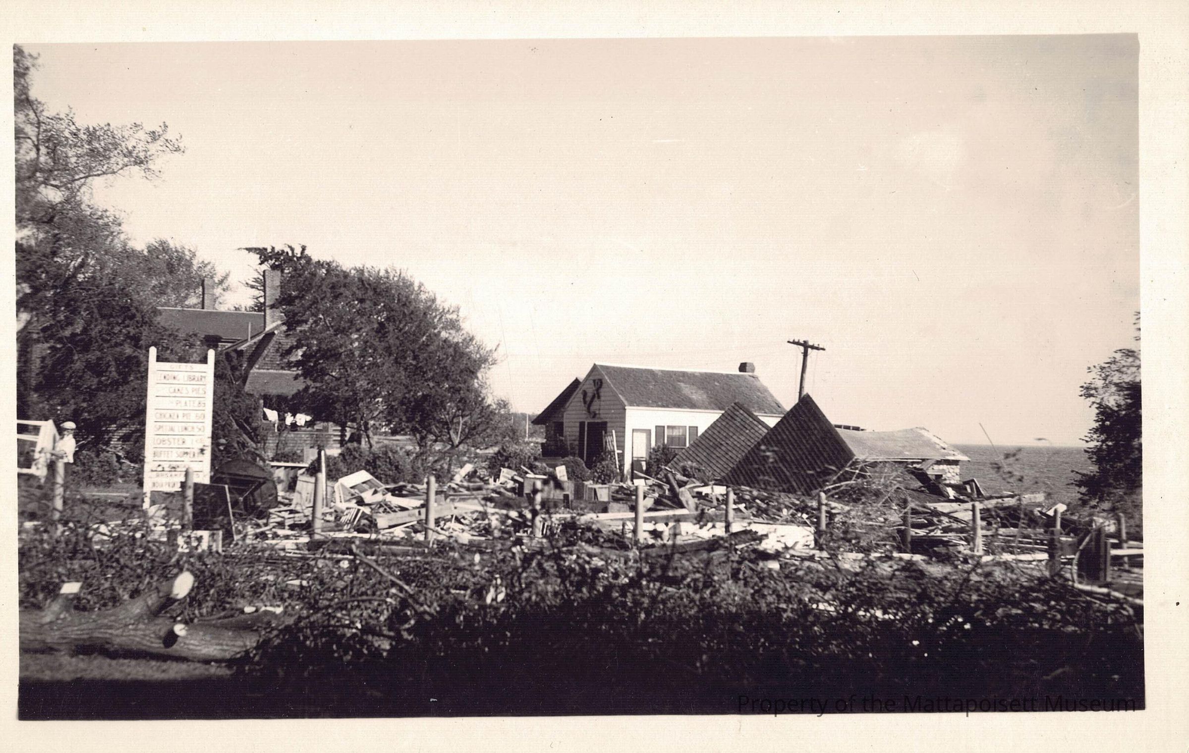 Black and white postcard showing 1938 Hurricane damage to the Anchorage Inn, Mattapoisett, Mass.Collection