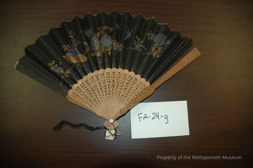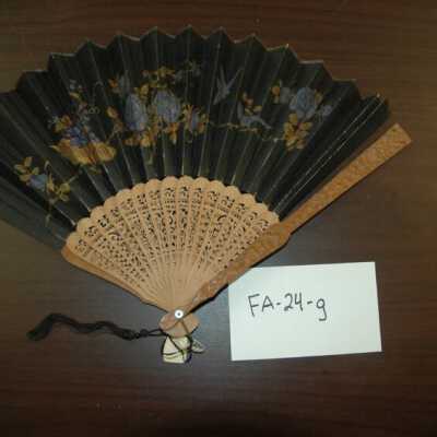 Sandalwood and black paper fan, with gold and blue flowers.Collection