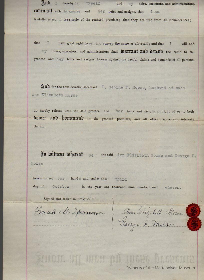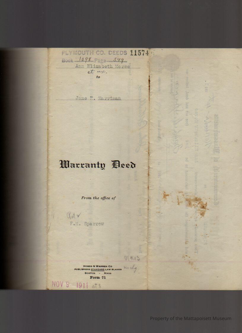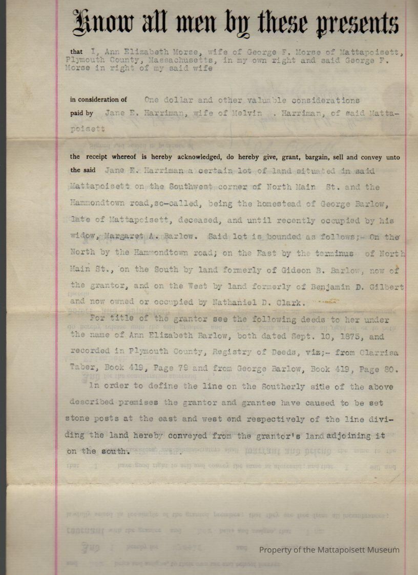 Ann Elizabeth & George F. Morse to Jane E. Harriman, land on the southwest corner of North Main Street and Hammondtown Road for $1 and other valuable considerations.Collection