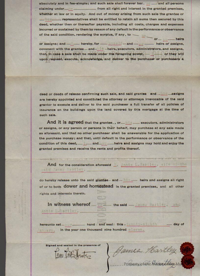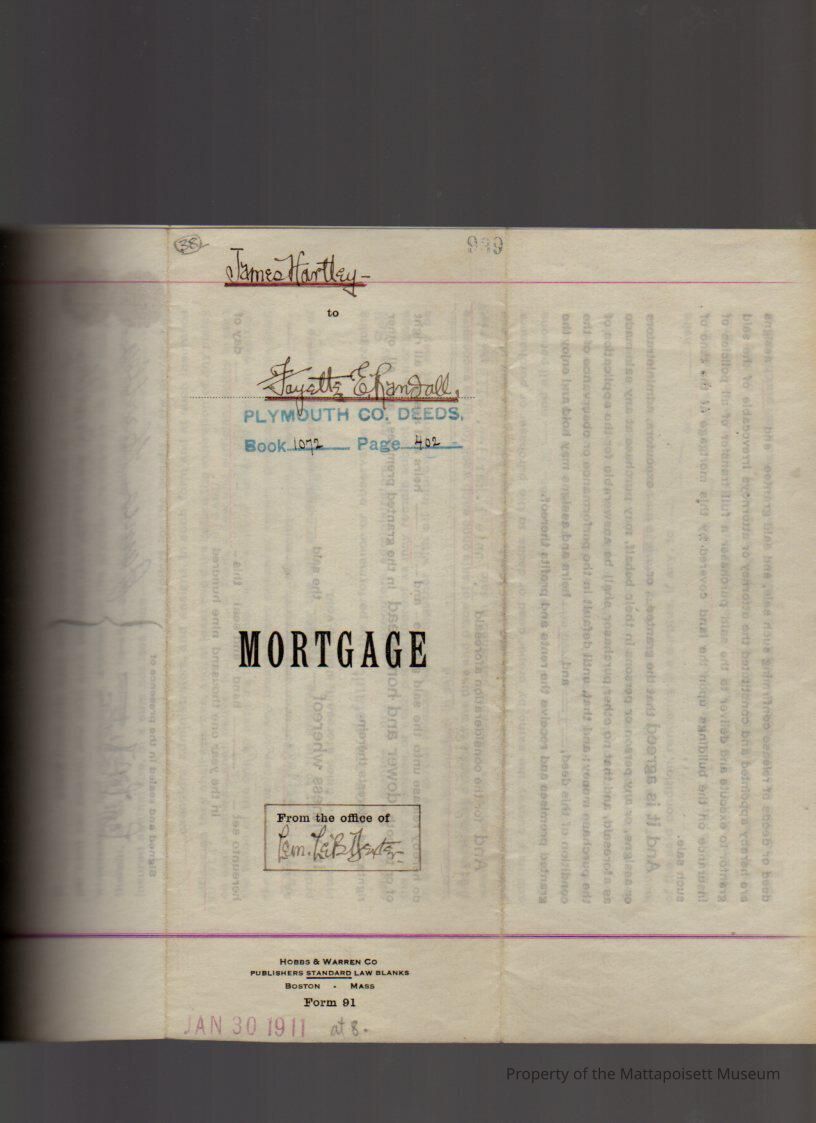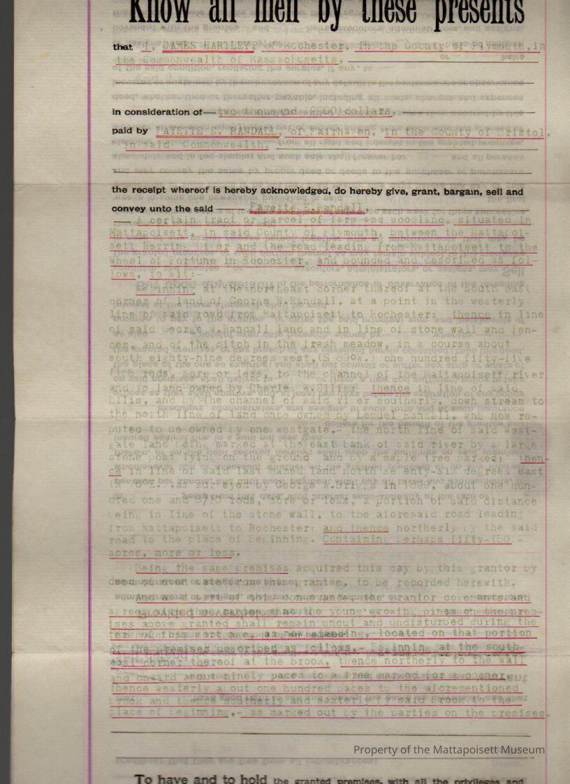 James & Annie L. Hartley of Rochester to Fayette E. Randall of Fairhaven, farm and woodland between the Mattapoisett Herring River and the road leading from Mattapoisett to the "Wheel of Fortune" in Rochester for $2,000.Collection