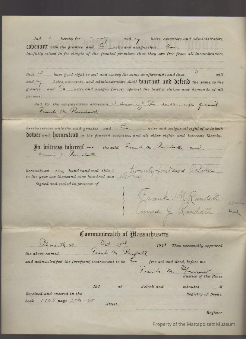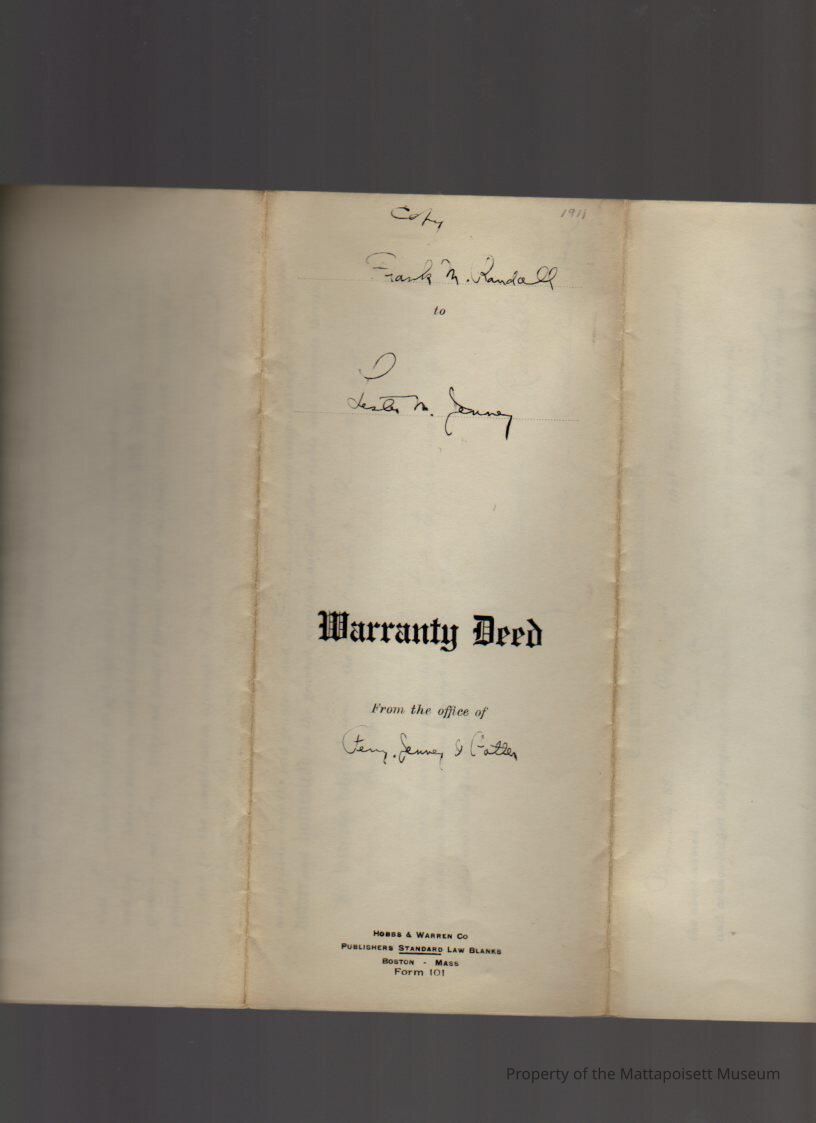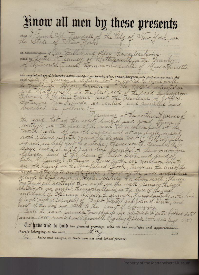 Frank M & Annie J. Randall of NYC to Lester W. Jenney, land and buildings at "The Cedars" for $1 and other considerations. Copy.Collection
