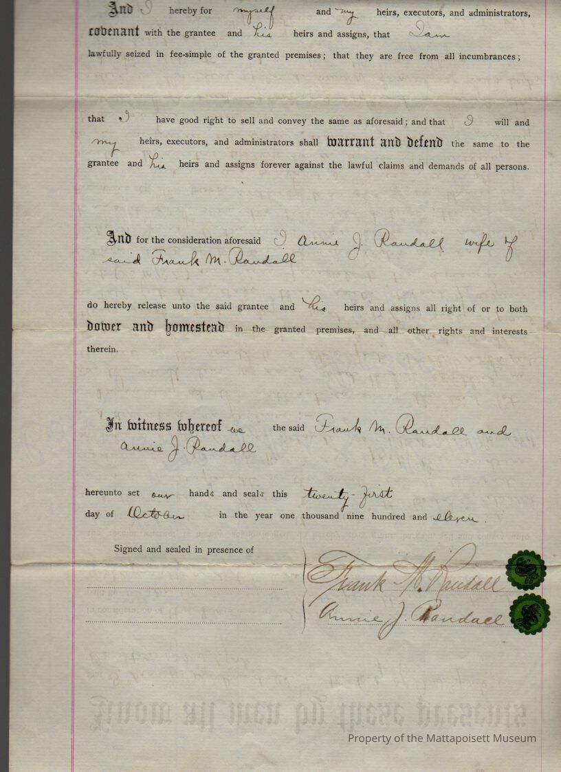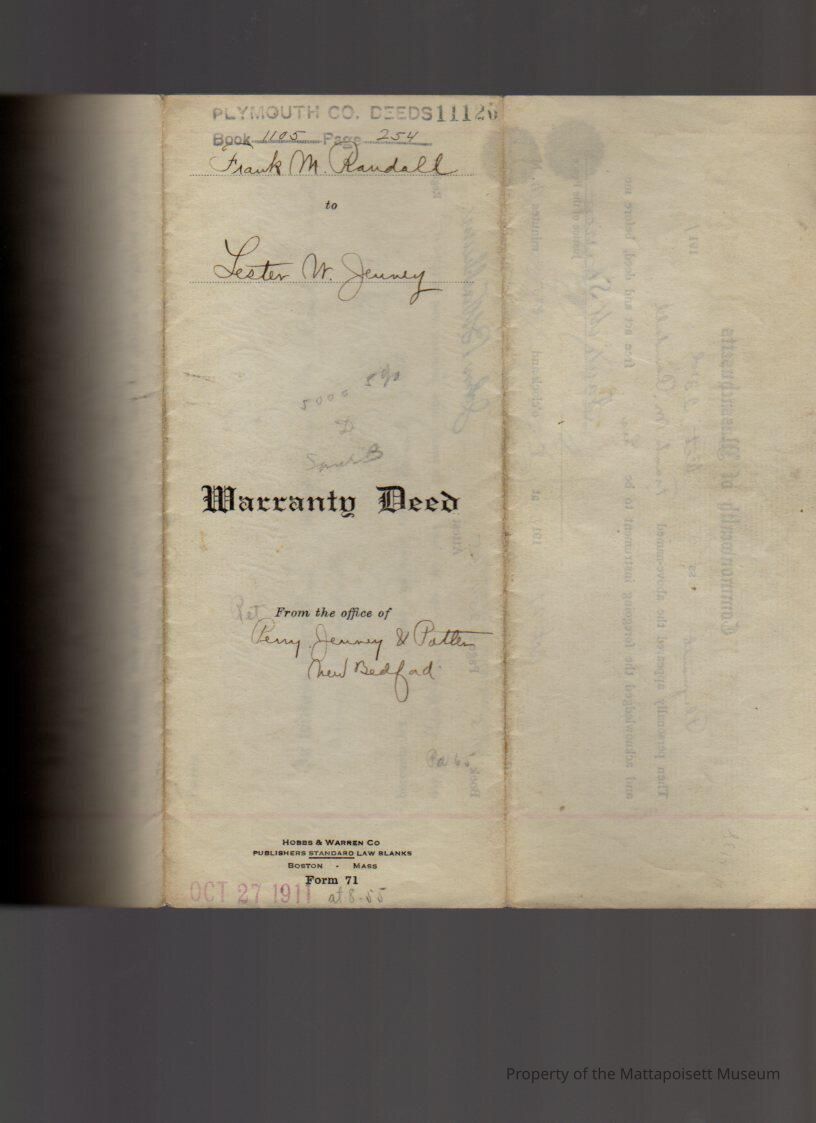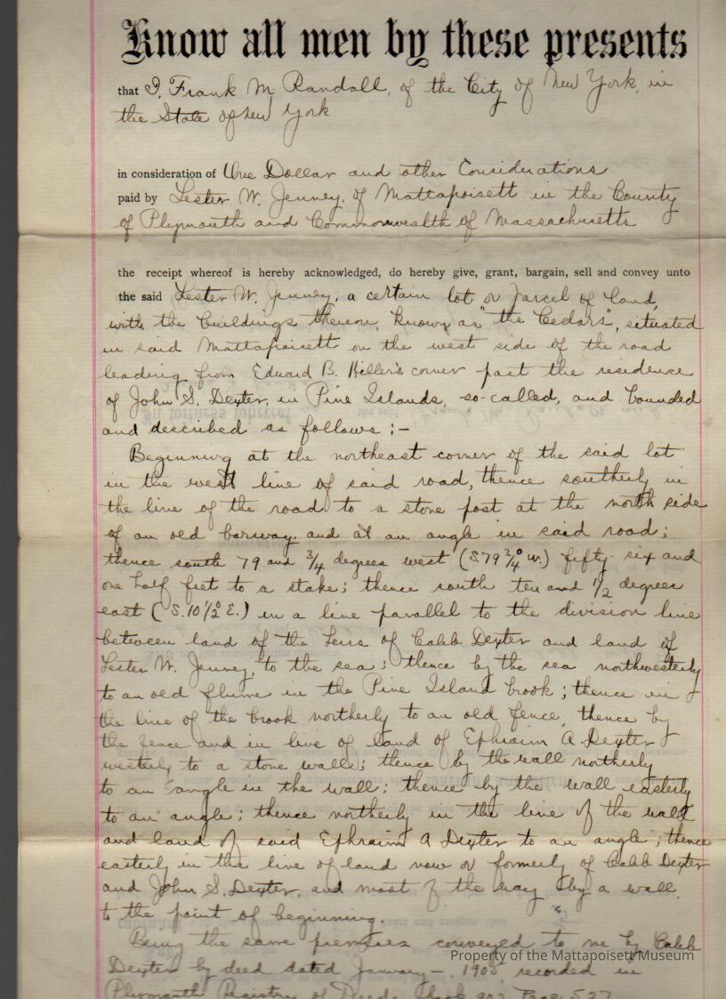 Frank M & Annie J. Randall of NYC to Lester W. Jenney, land and buildings at "The Cedars" for $1 and other considerations. Copy.Collection