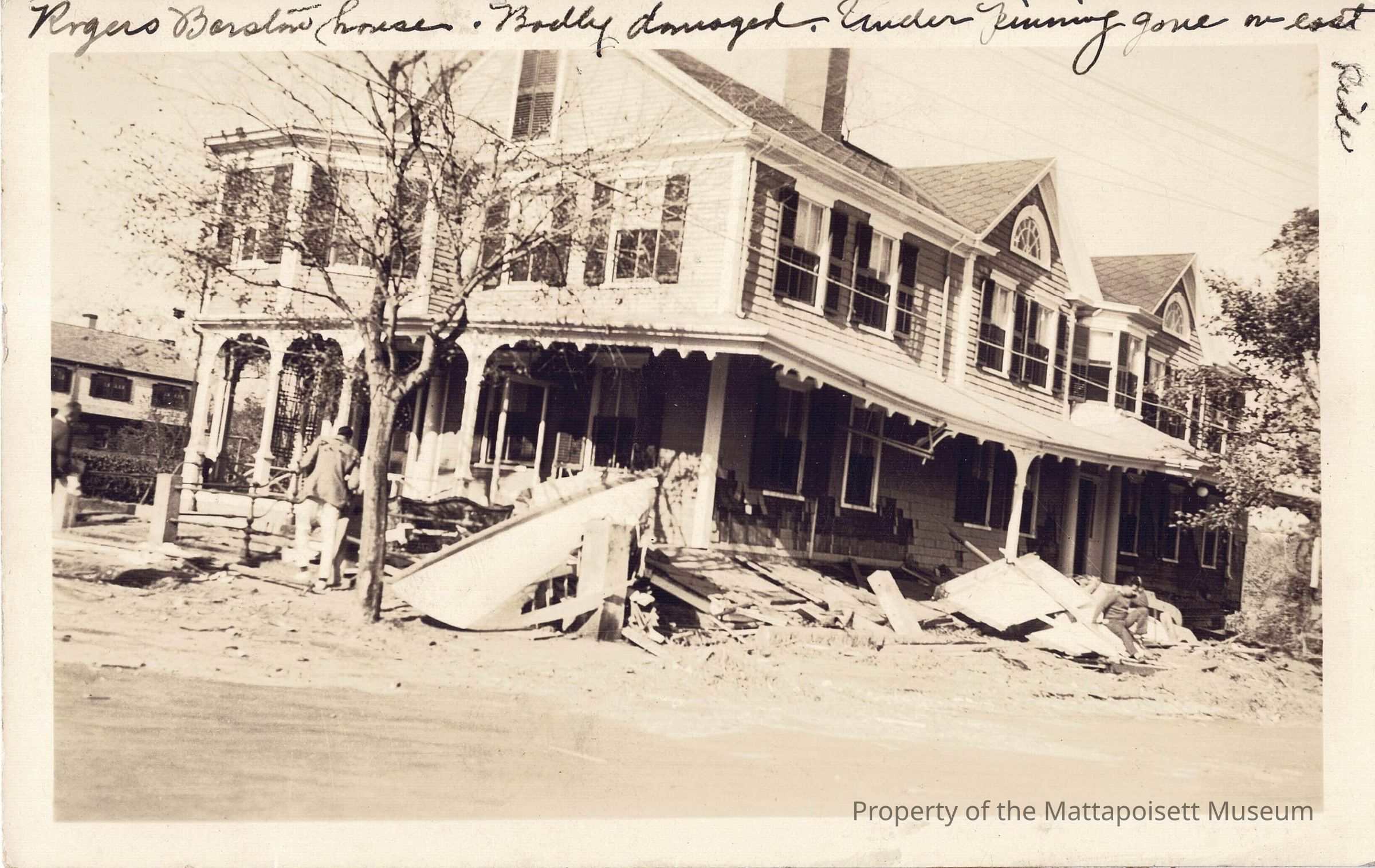 Black and white postcard showing damage from the Hurricane of 1938. Hand-written in black ink "Roger Barstow house badly damaged under pinning gone on east side" .Collection