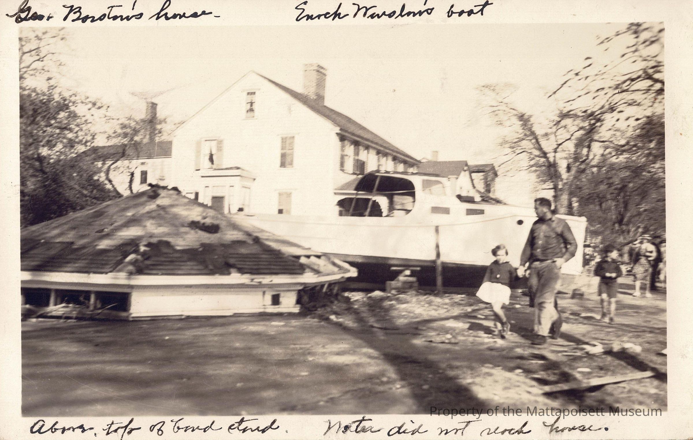 Black and white postcard showing hurricane of 1938 damage. Hand-written in black ink "George Barstow's house; Enoch Winslow's boat; Abors top of band stand; water did not reach house."Collection