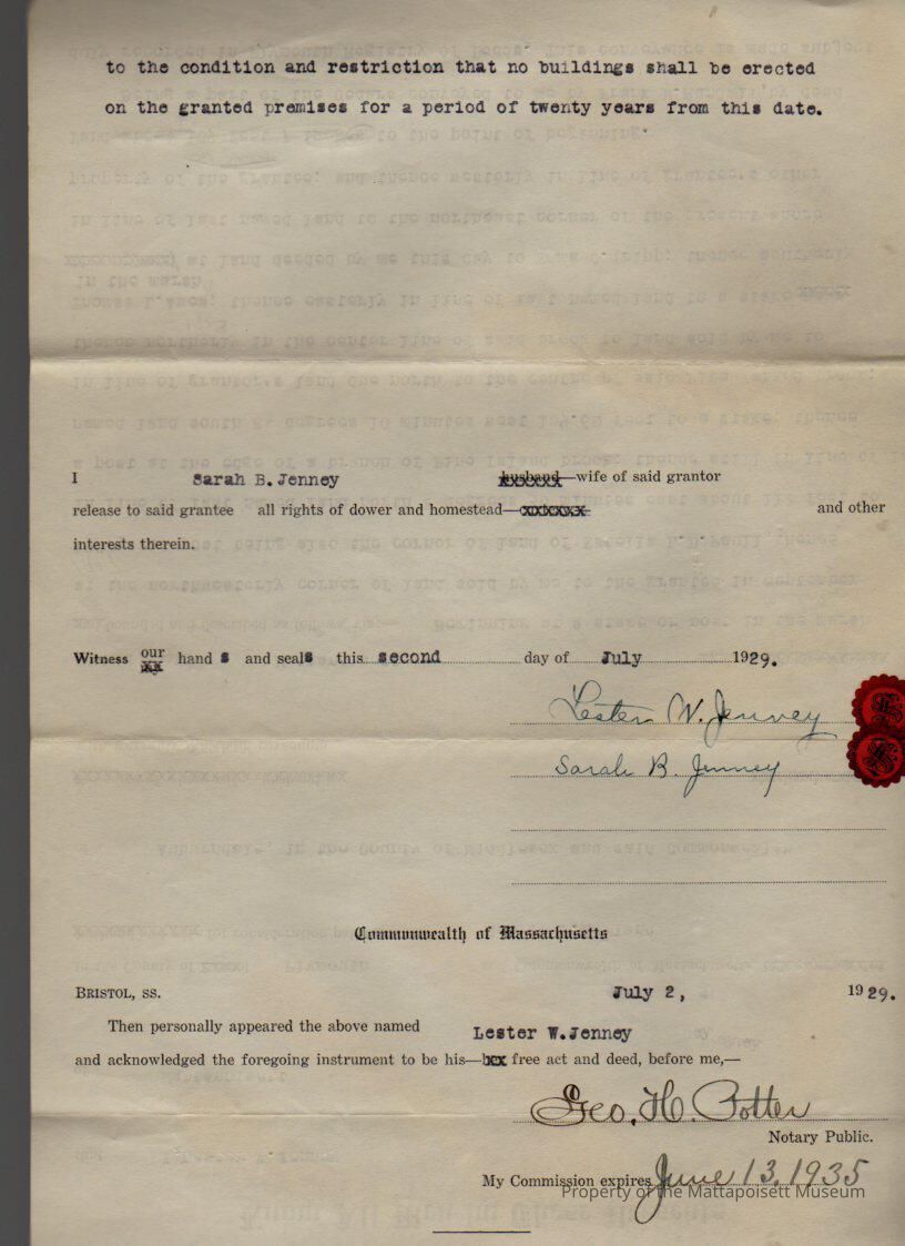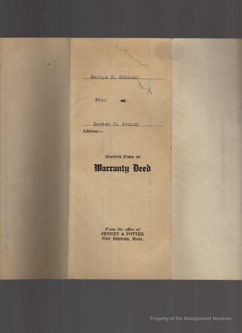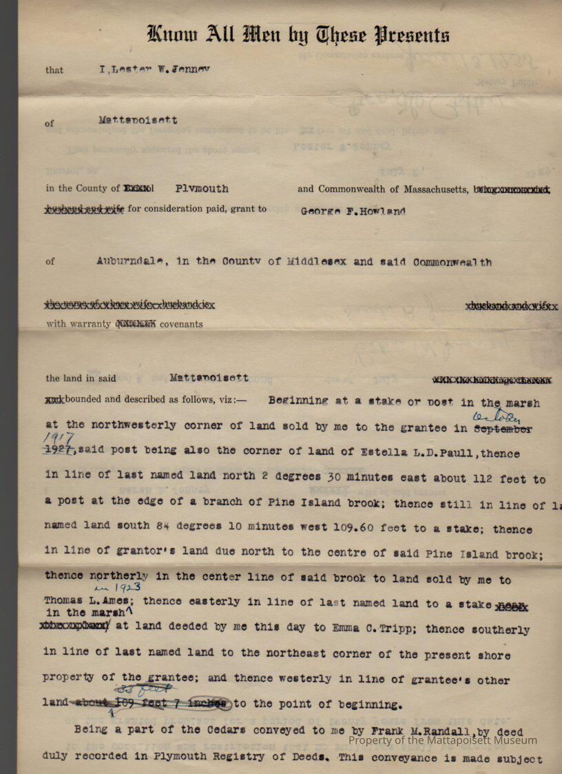Lester W. & Sarah B. Jenney to George F. Howland, land at the Cedars (with the condition and restriction that no buildings shall be erected on the premises for a period of 20 years).Collection
