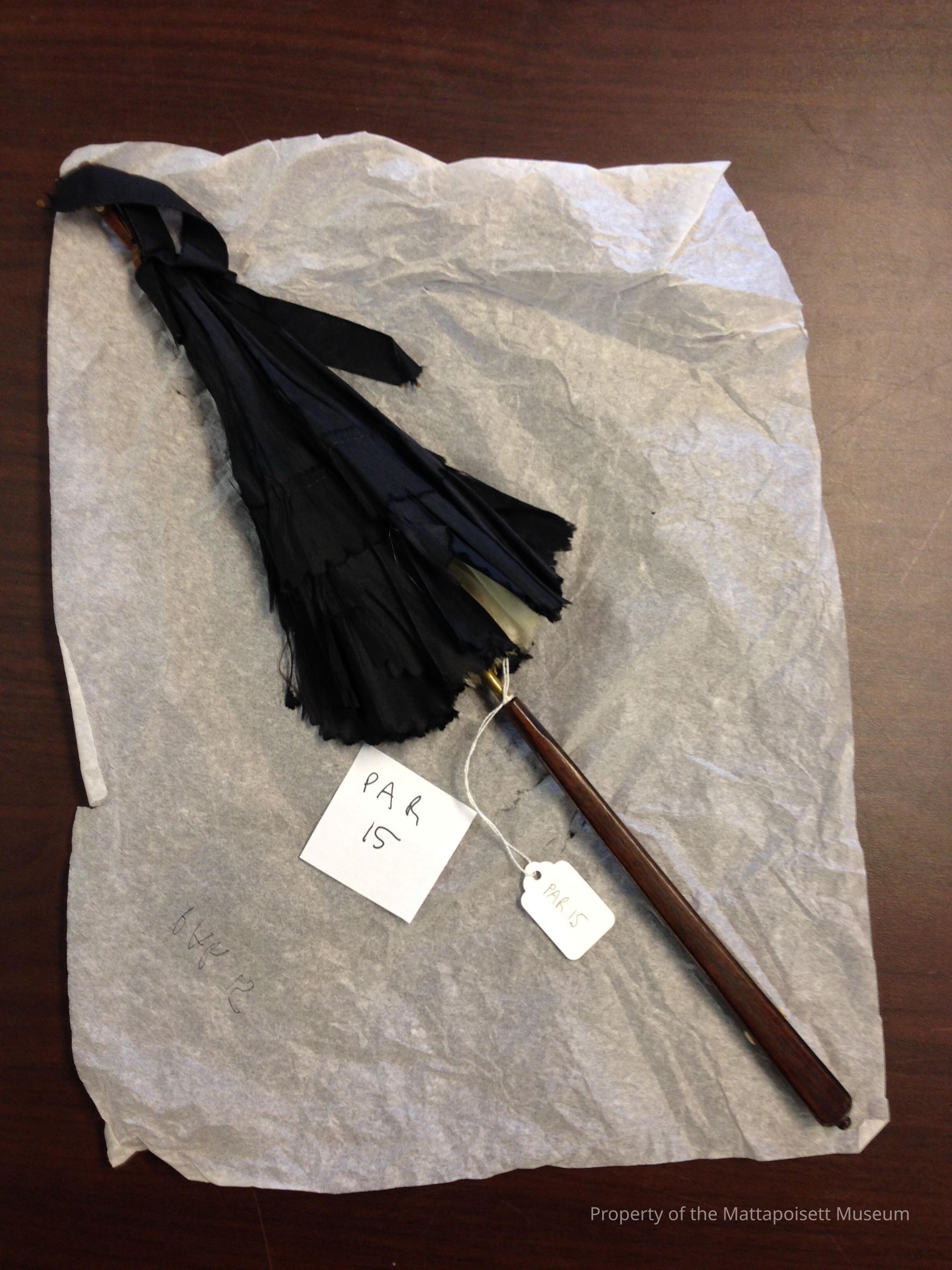 Black silk with ivory lining, bow at top. Wooden handle with small, round ivory inset on handle and tip.Collection