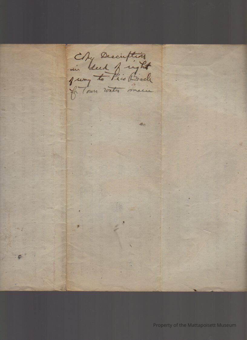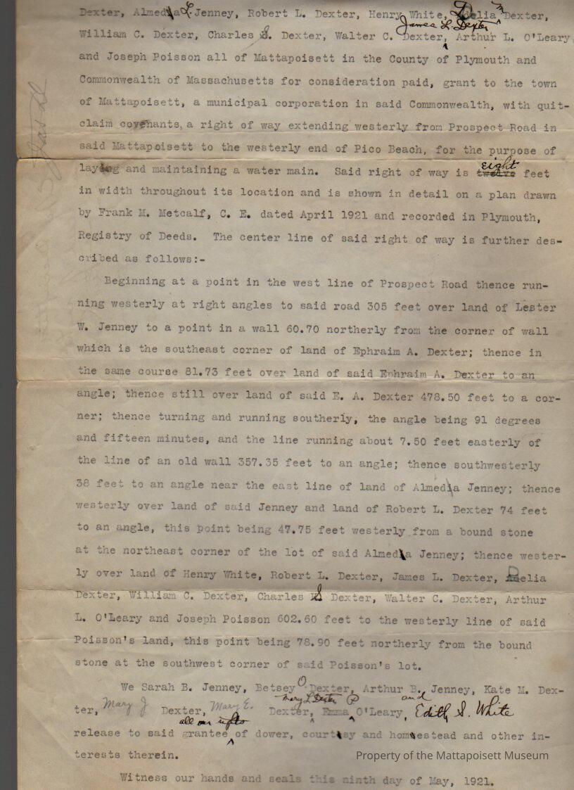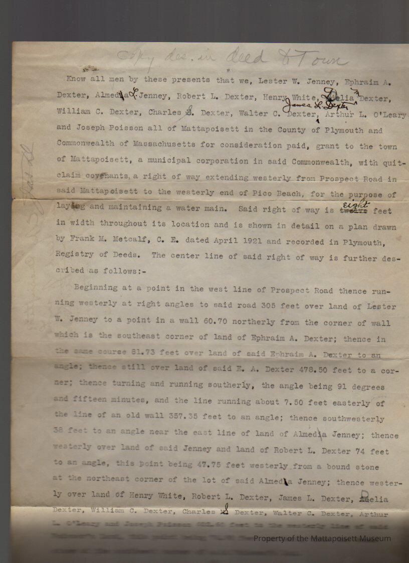 Copy of a description in deed of right-of-way to Pico Beach for town water main, Lester W. Jenney, Ephraim A. Dexter, Almedia L. Jenney, Robert L. Dexter, Henry White, Delia M. Dexter, William C. Dexter, Charles S. Dexter, Walter C. Dexter, Arthur L. O'Leary and Joseph Poisson to Town of Mattapoisett, right-of-way extending westerly from Prospect Road to the westerly end of Pico Beach.Collection