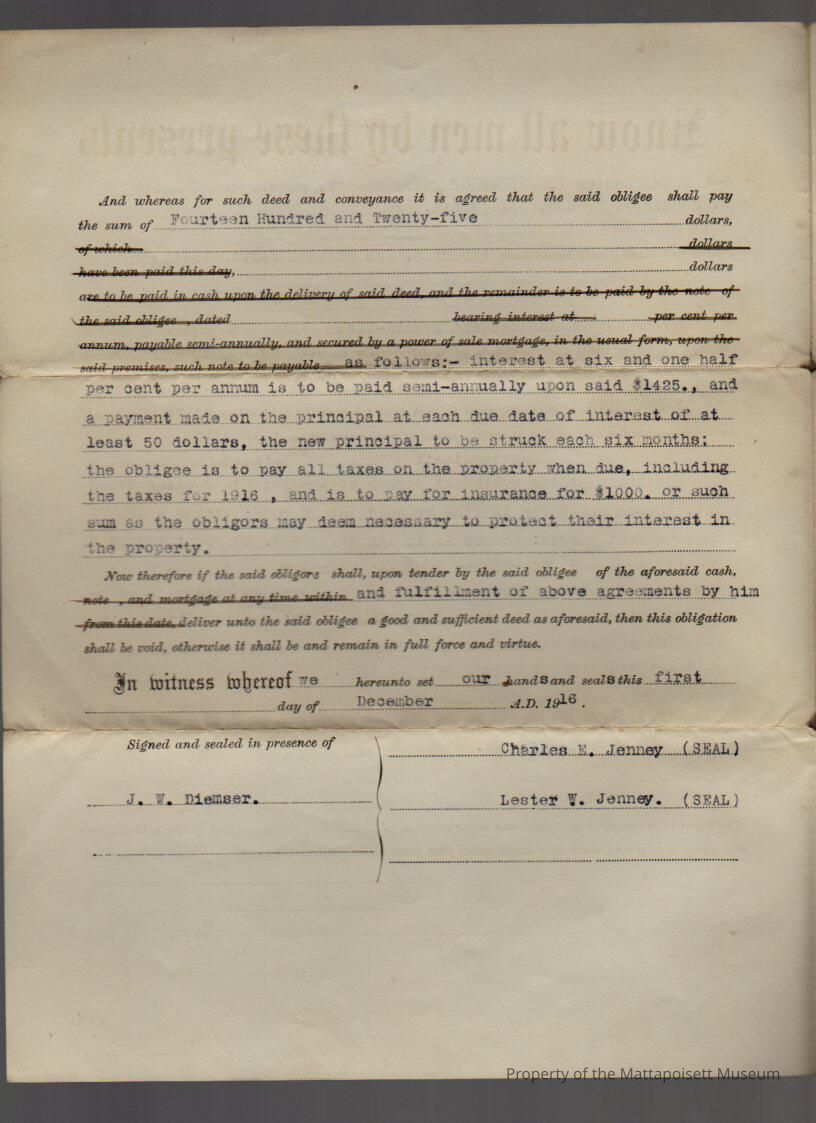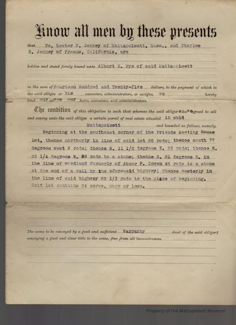 Charles E. Jenney & Lester W. Jenney, mortgage to Albert E. Nye, land in Mattapoisett for $1,425. Copy.Collection