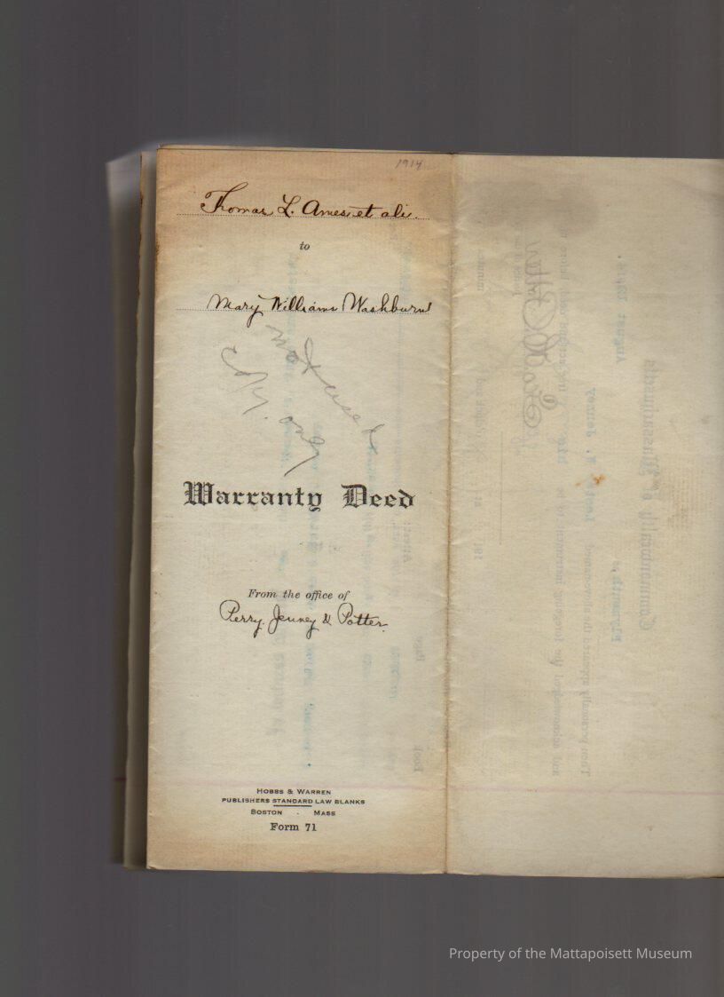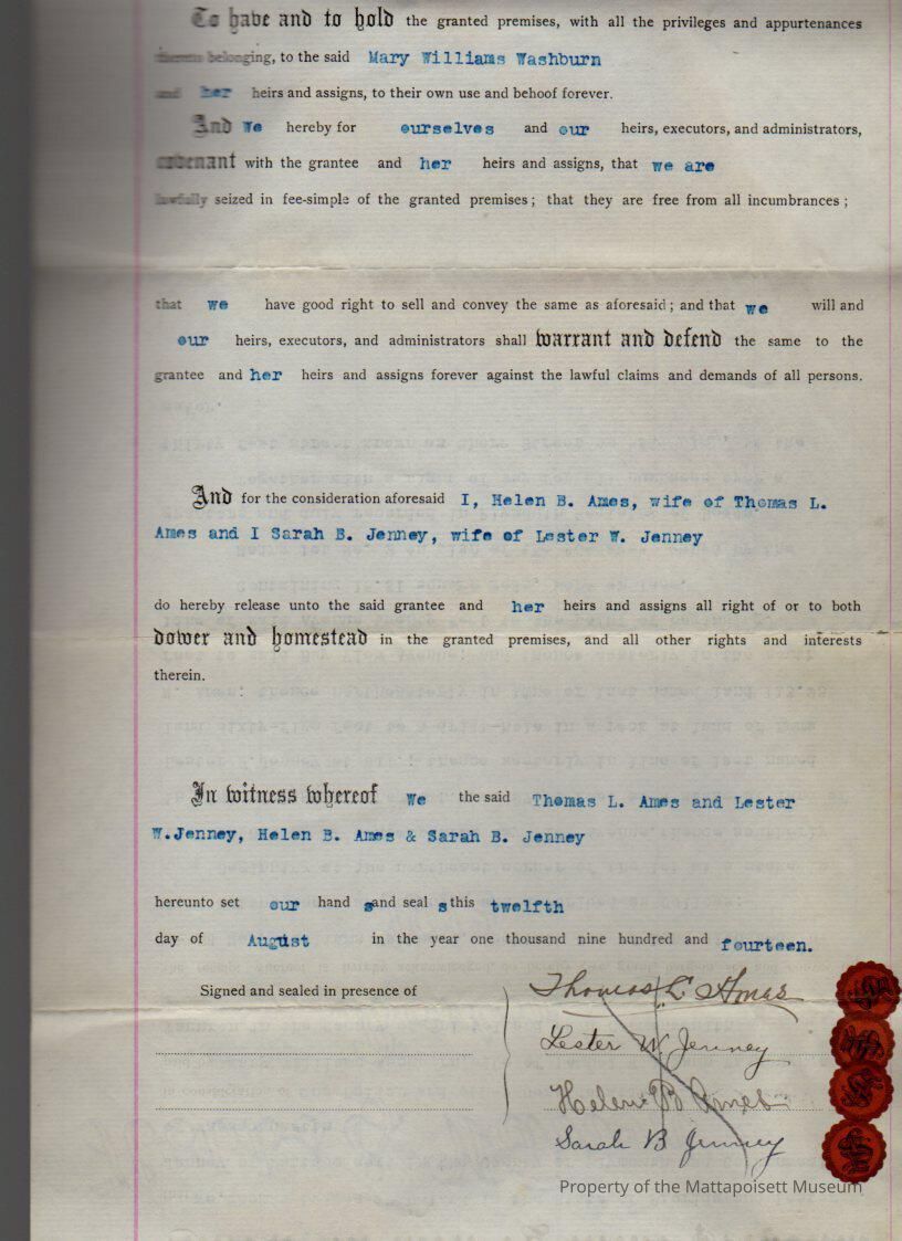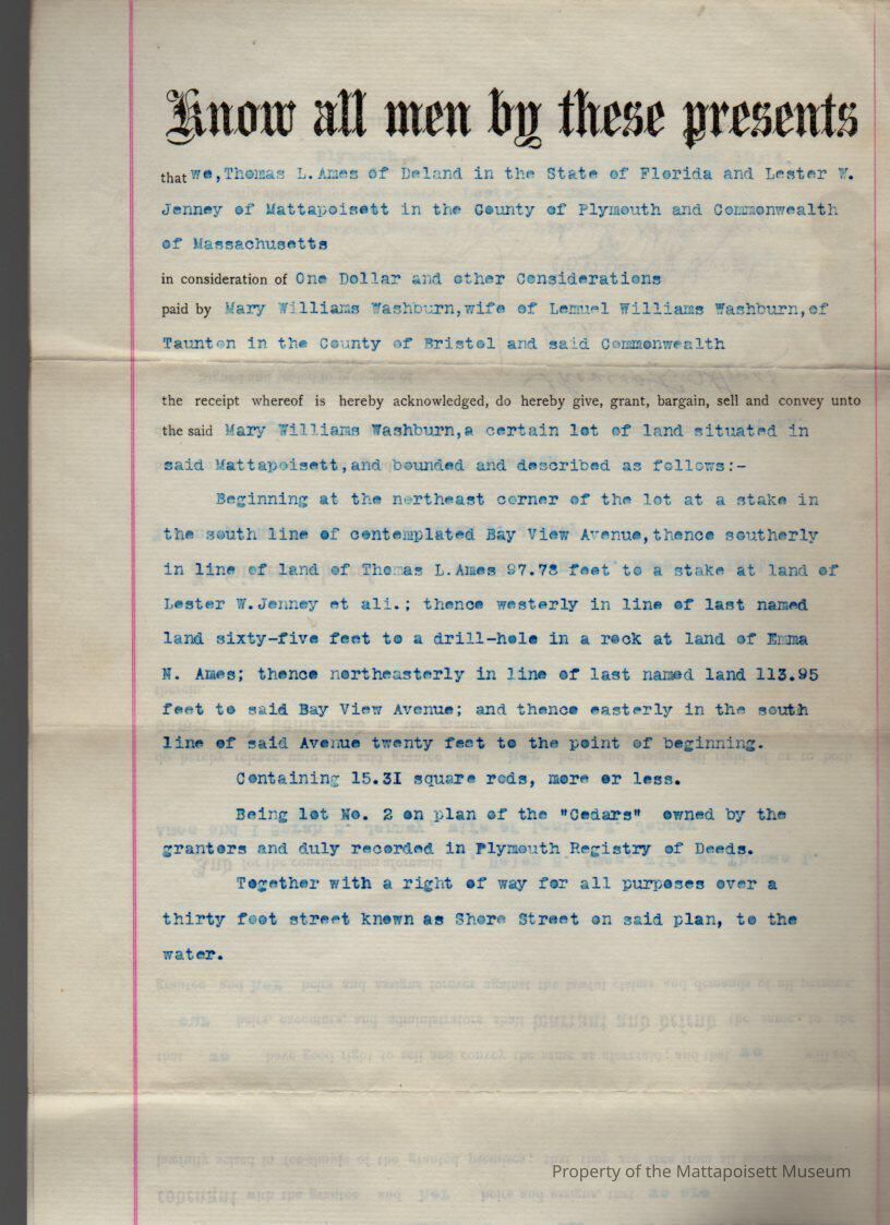 Thomas L. & Helen B. Ames and Lester W. & Sarah B. Jenney to Mary Williams & Lemuel Williams Washburn, 15.31 square rods land known as the "Cedars" for $1 and other considerations.Collection