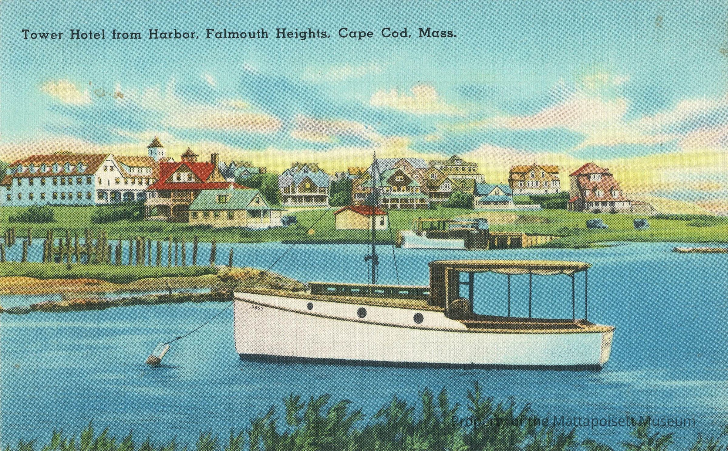 Hand-colored postcard showing Tower Hotel from Harbor, Falmouth Heights, Cape Cod, Mass.Collection