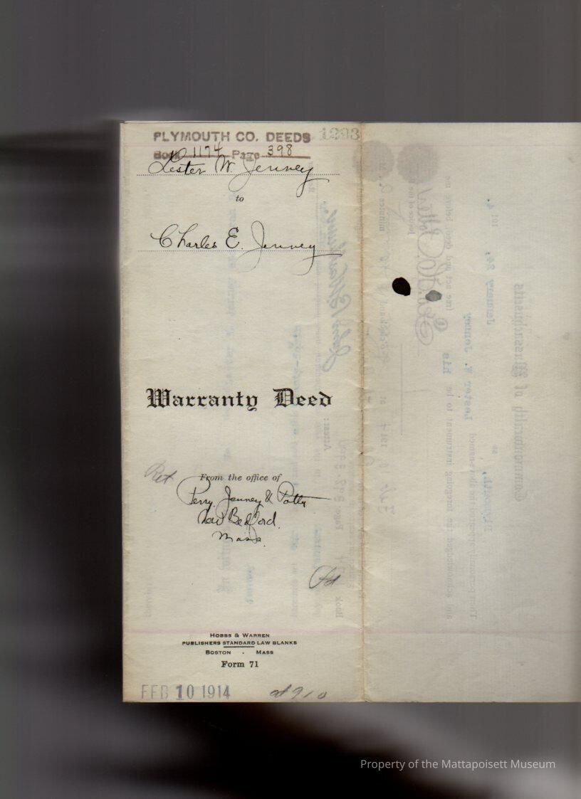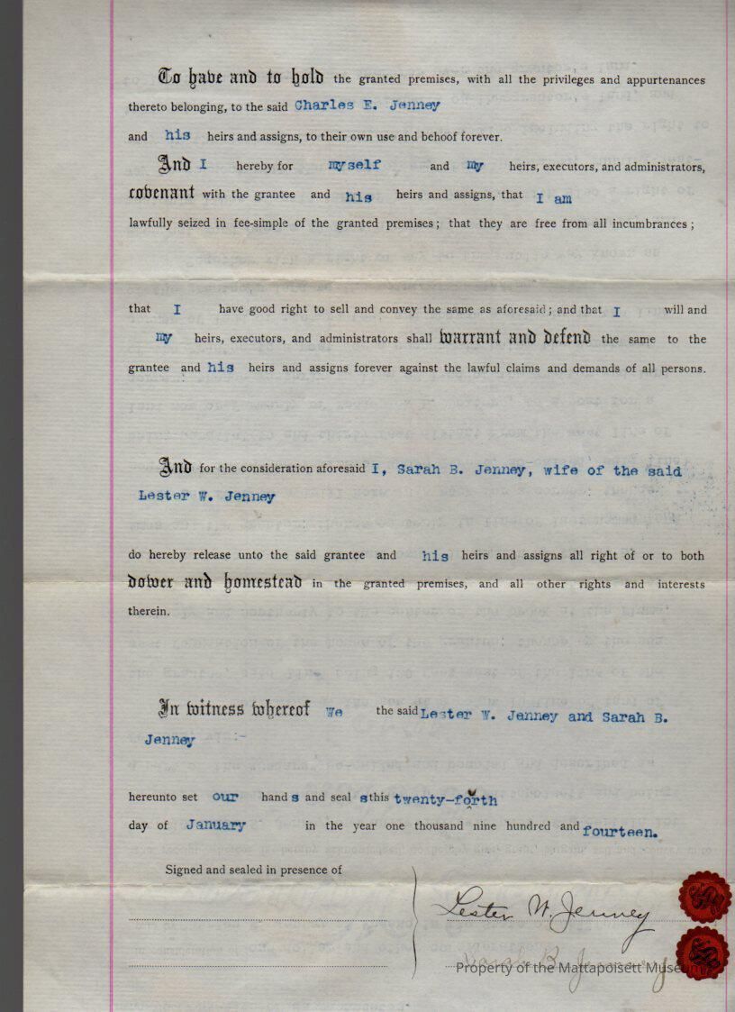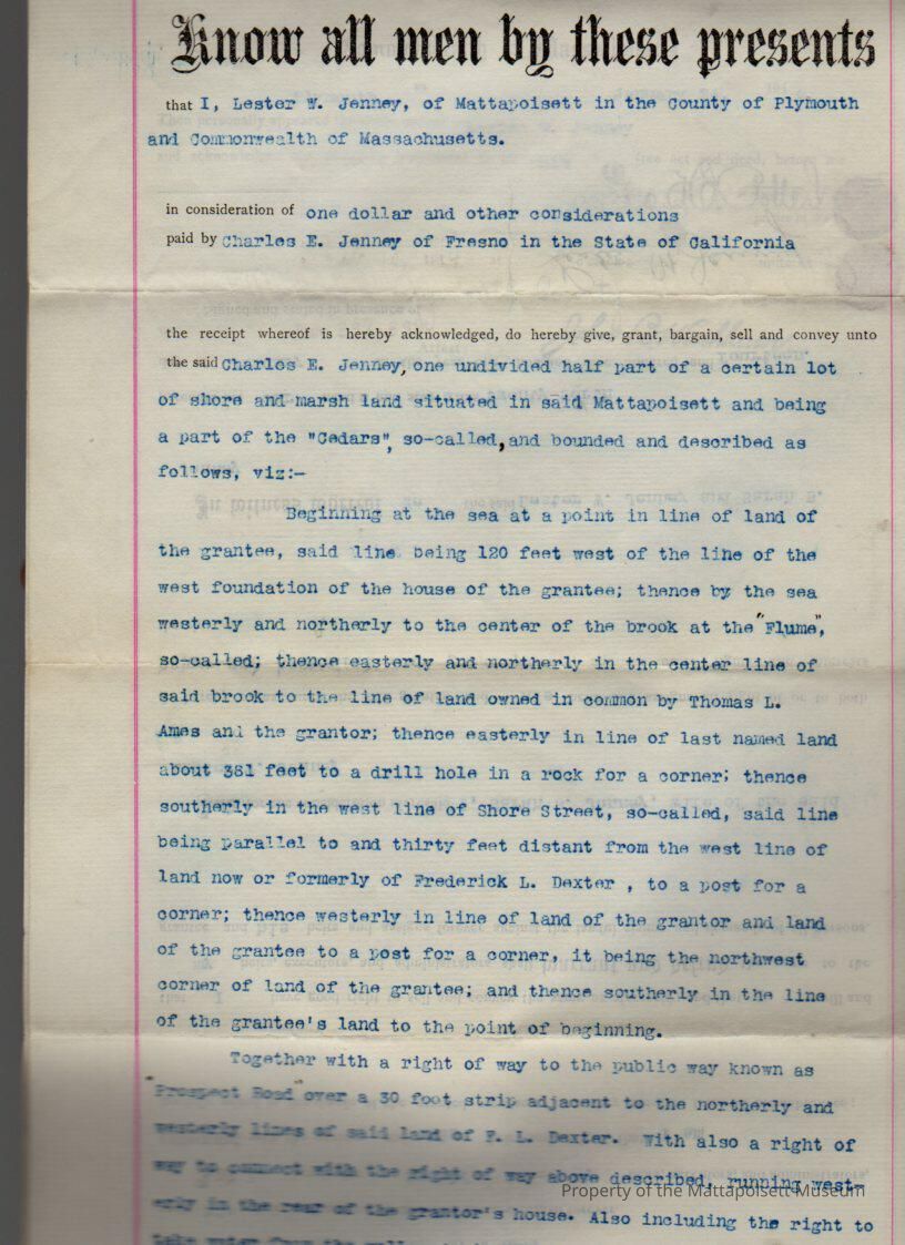 Lester W. & Sarah B. Jenney to Charles E. Jenney of Fresno CA, lot of shore and marsh known as the "Cedars" for $1 and other considerations.Collection