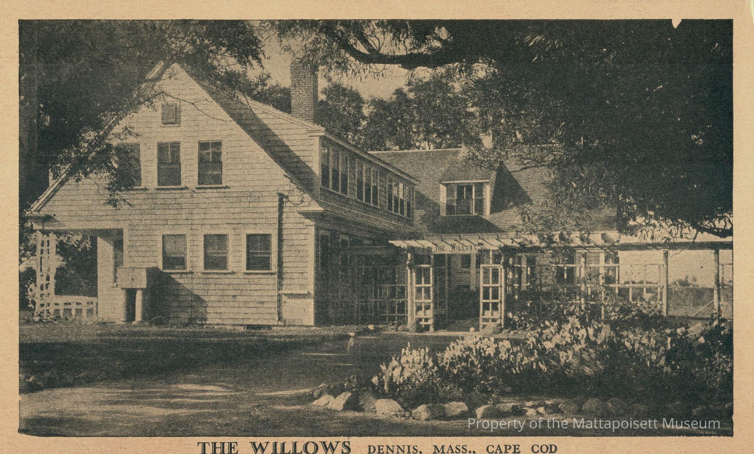 Black and white postcard showing The Willows, Dennis, Mass., Cape Cod. Hand-written note on reverse from Edna D. Pegg tyo Miss Mildred R. Curtis, 2703 Central Avenue, Cleveland, Ohio. Postmarked from Dennis, Mass. on August 10, 1938.Collection