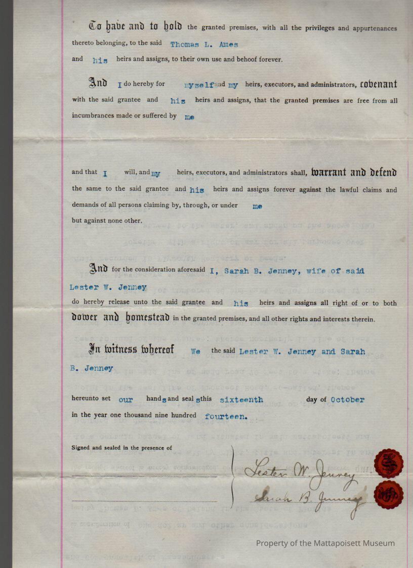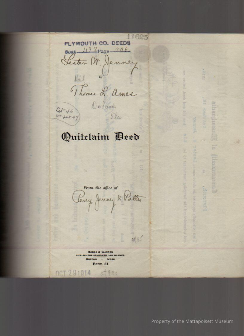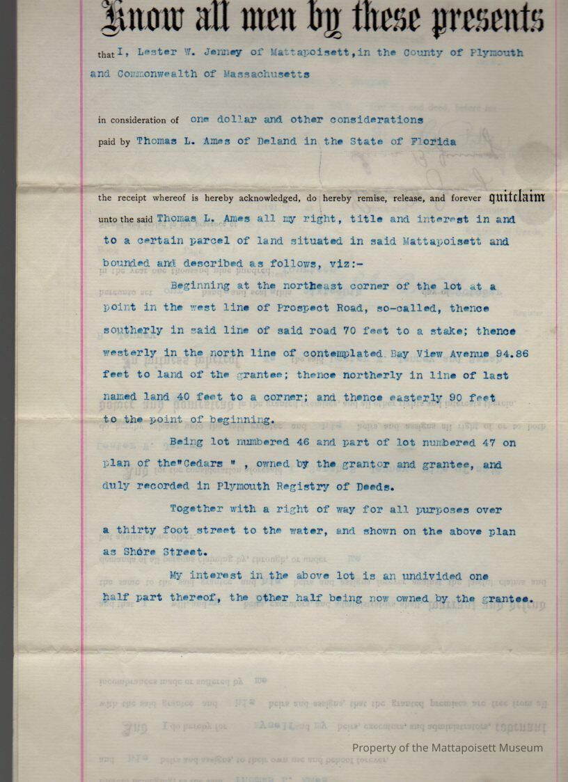 Lester W. & Sarah B. Jenney to Thomas L. Ames, land at the "Cedars" with right-of-way to the water for $1 and other considerations.Collection