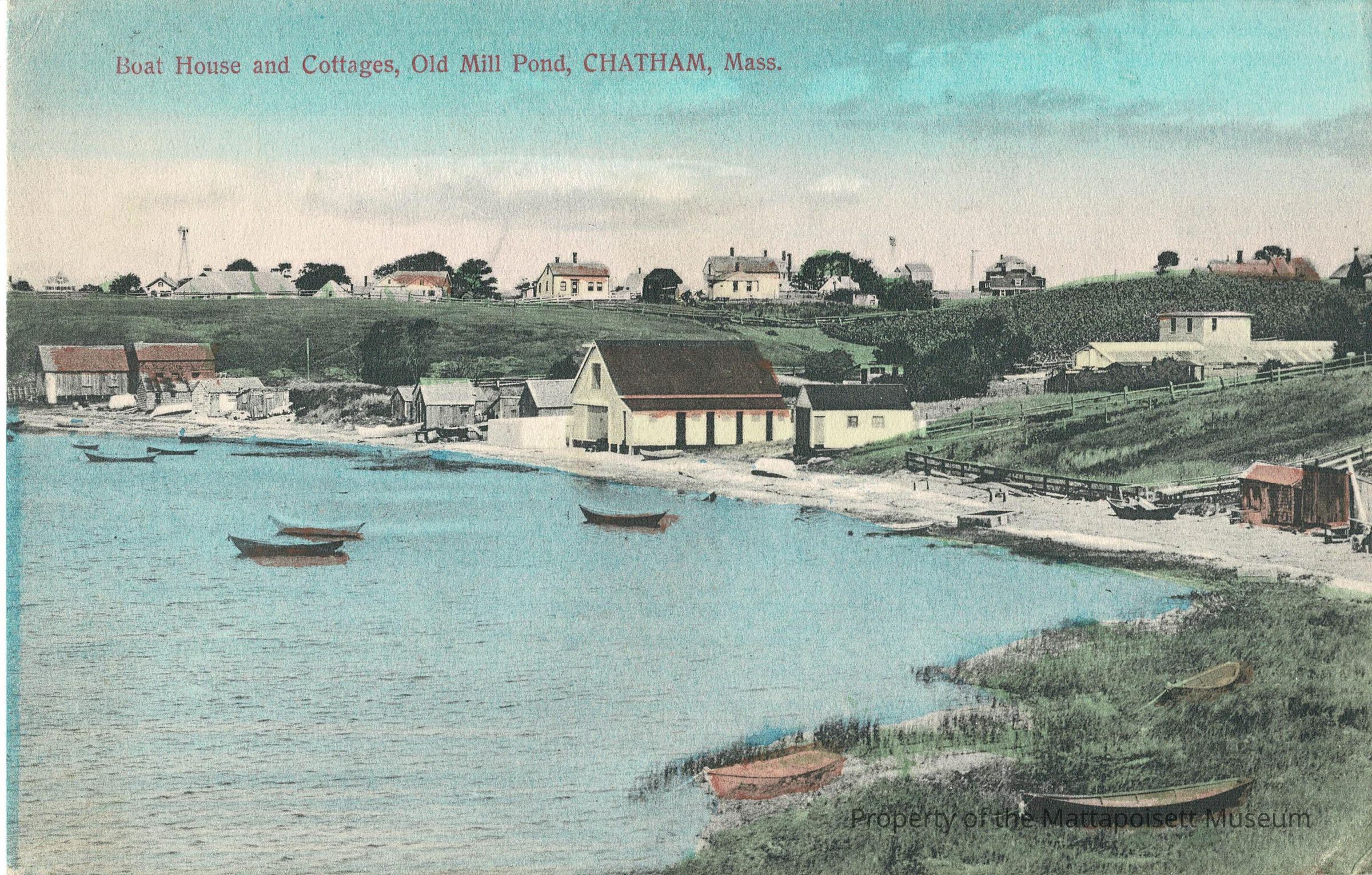 Hand-colored postcard showing Boat House and Cottages, Old Mill Pond, Chatham, Mass. Hand-written note on reverse to Mrs. A.P.Purrington, Mattapoisett, Mass. Postmarked from Chatham, Mass. on August 25, 1908.Collection