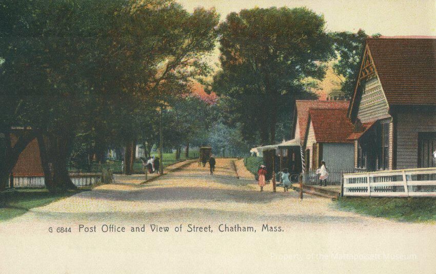 Hand-colored postcard showing Post Office and View of Street, Chatham, Mass. Hand-written note on reverse from Cousin George to Mrs. George Purrington, Jr., Mattapoisett, Mass. Postmarked from New Bedford, Mass on February 22 (1912 handwritten).Collection