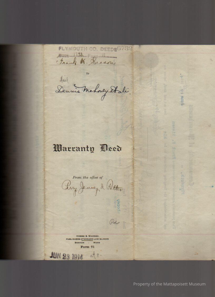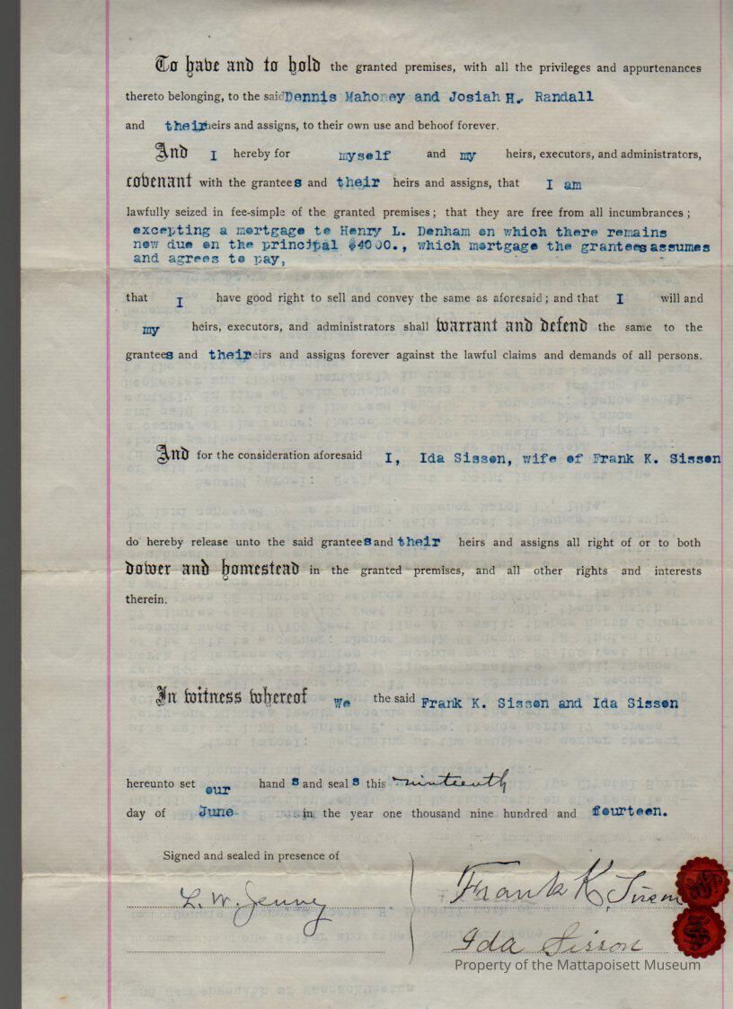 Frank K. & Ida Sisson to Dennis Mahoney & Josiah H. Randall, two parcels of land and buildings on the road leading to Rochester, known as King Phillips Crystal Spring Road for $1 and other considerations.Collection