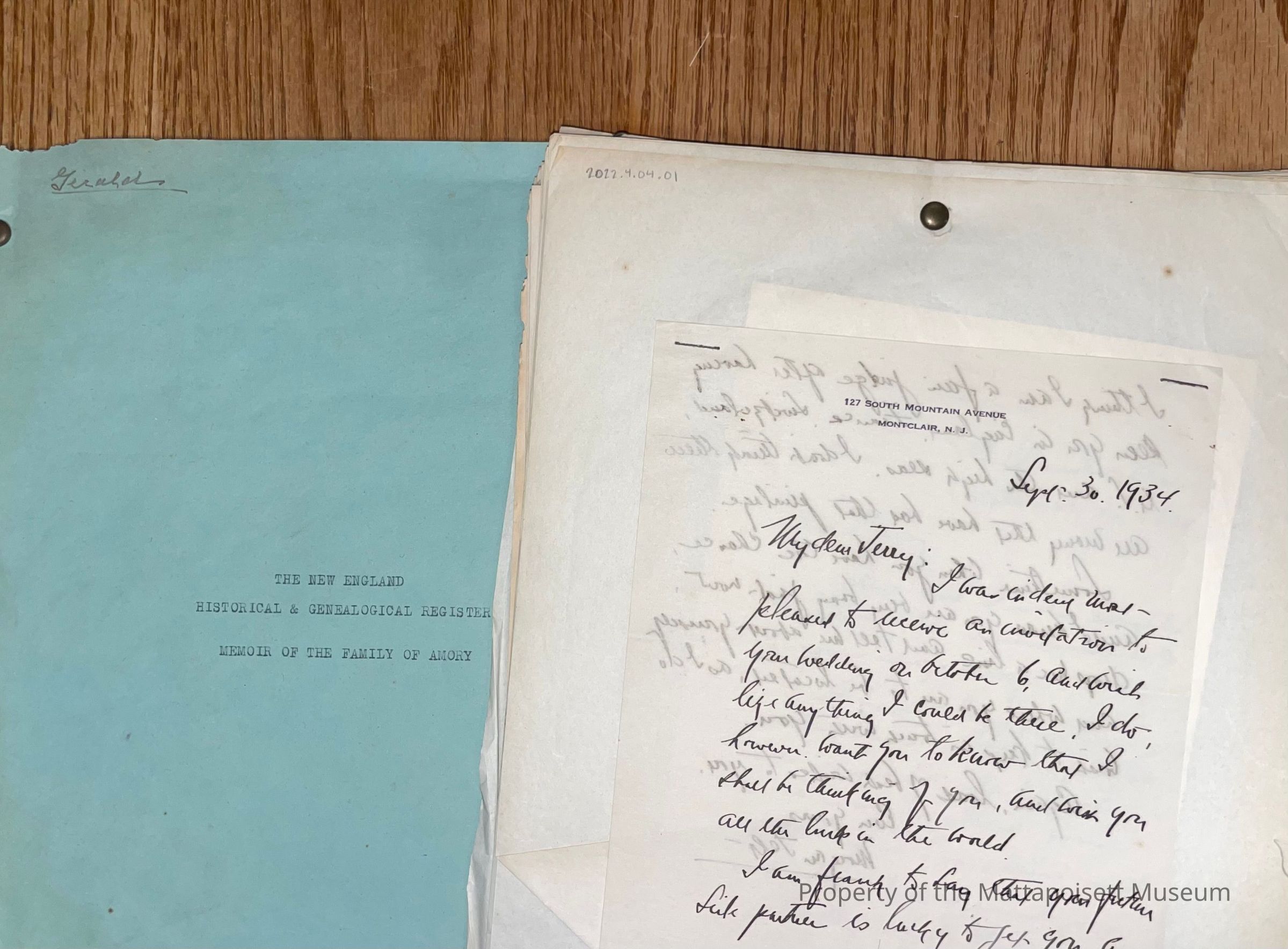 George W. Harrington Collection - Gerald Harrington's papers: 2022.4.04.01 - A stack of papers held together by a brass pin. The papers are documents, correspondence, and notes about Gerald Harrington's wedding in 1934. 2022.4.04.02 - a booklet titled "The New England Historical & Genealogical Register. Memoir of the Family of Amory" with the name "Gerald" written across the top in Harrington's handwriting.