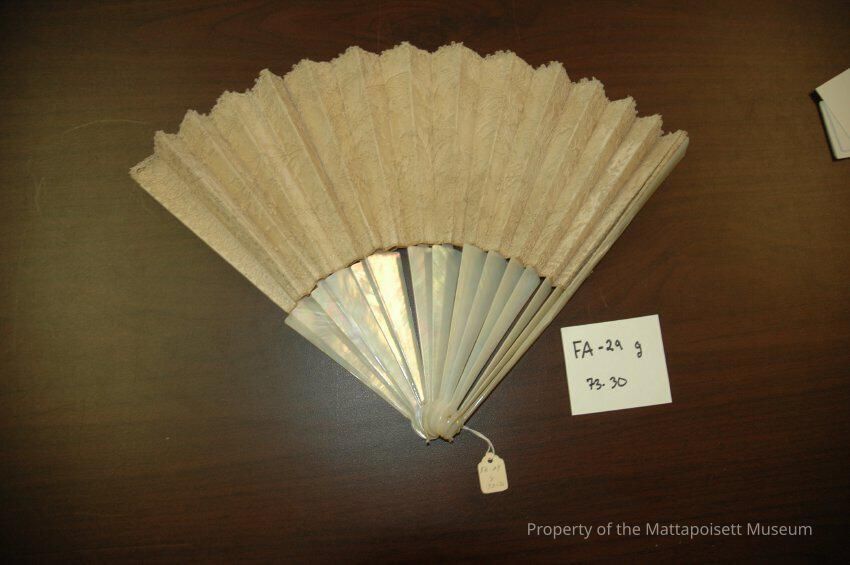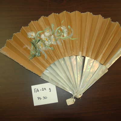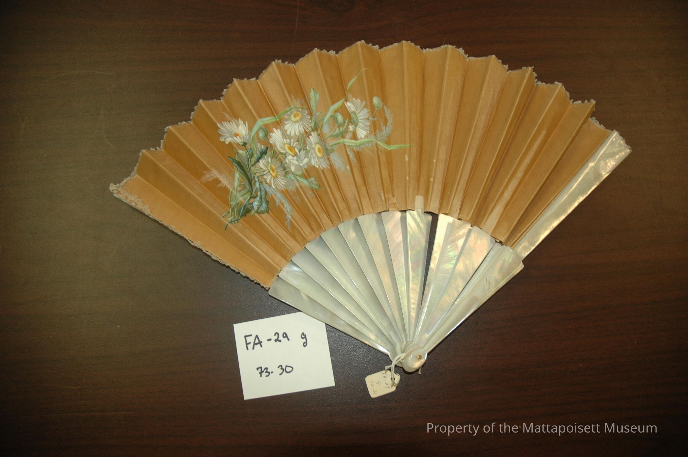 Silk fan with mother-of-pearl handle. One side gold with painted daisies, the reverse is lace.Collection