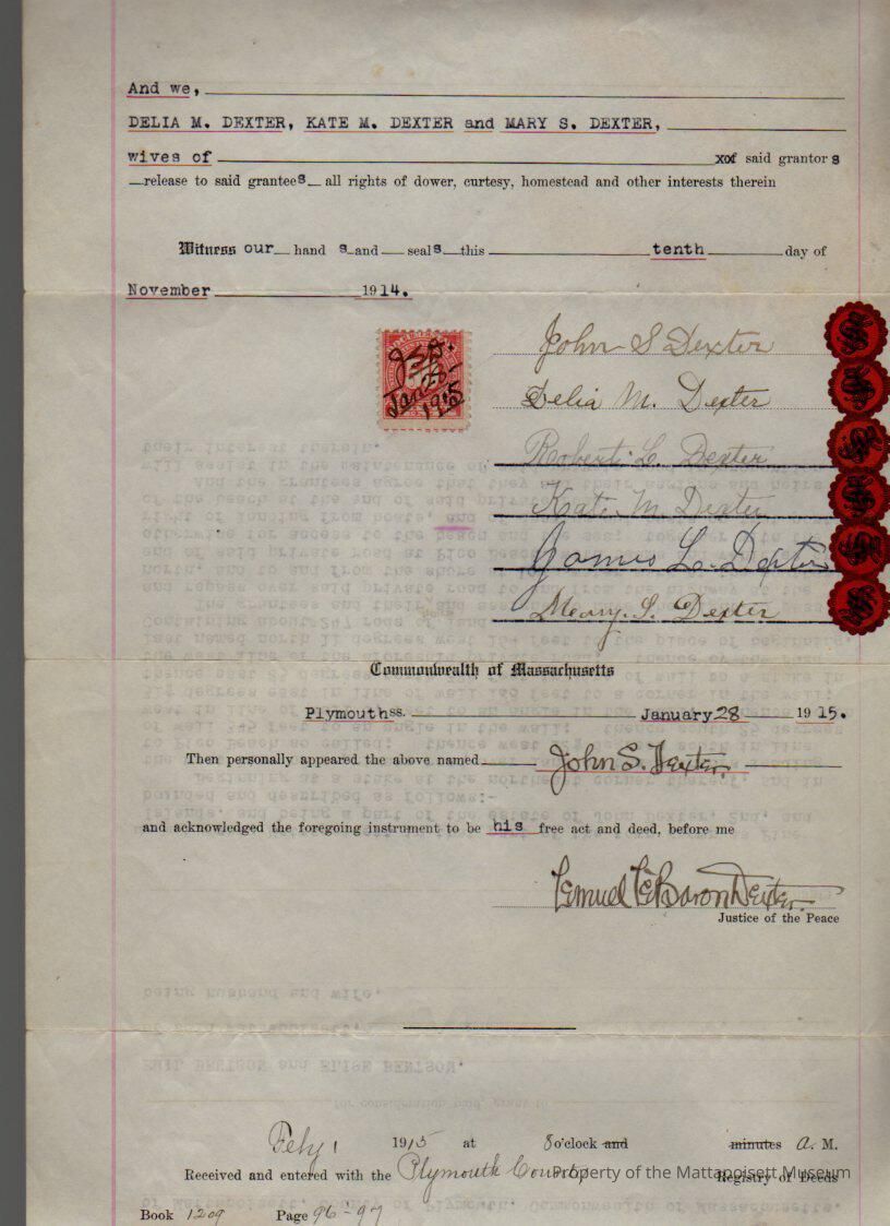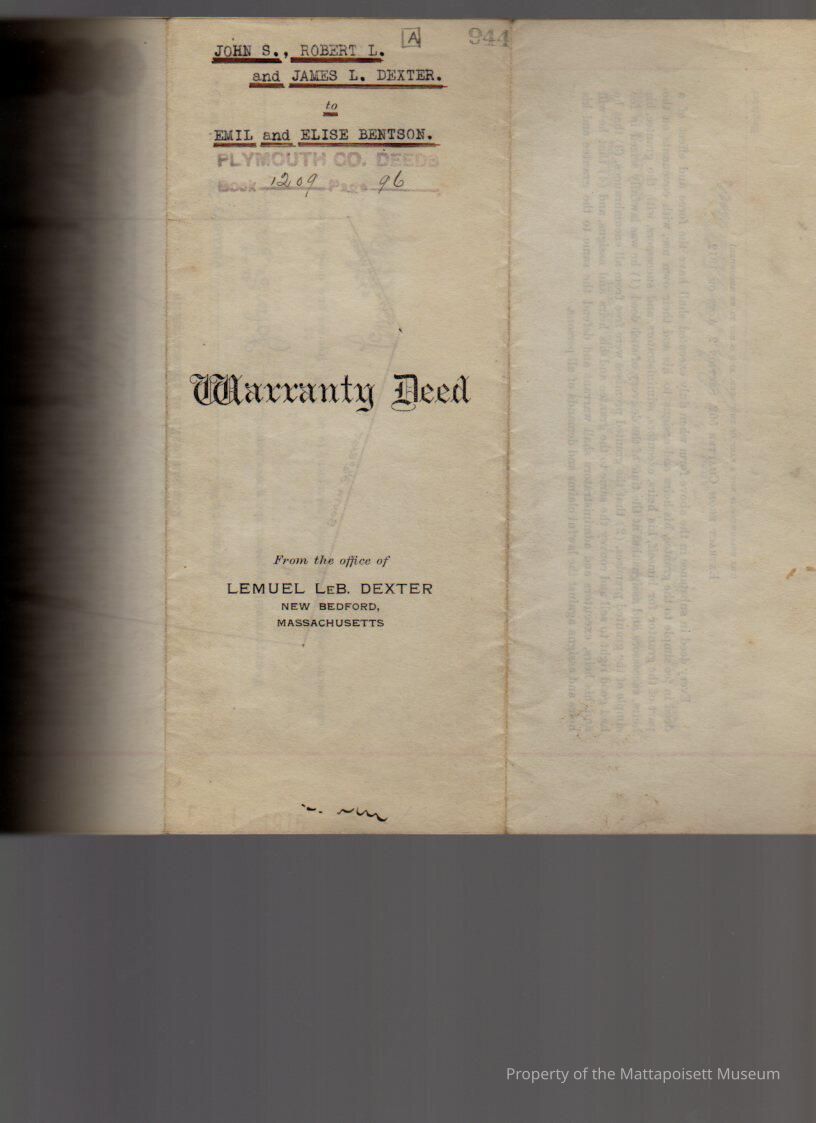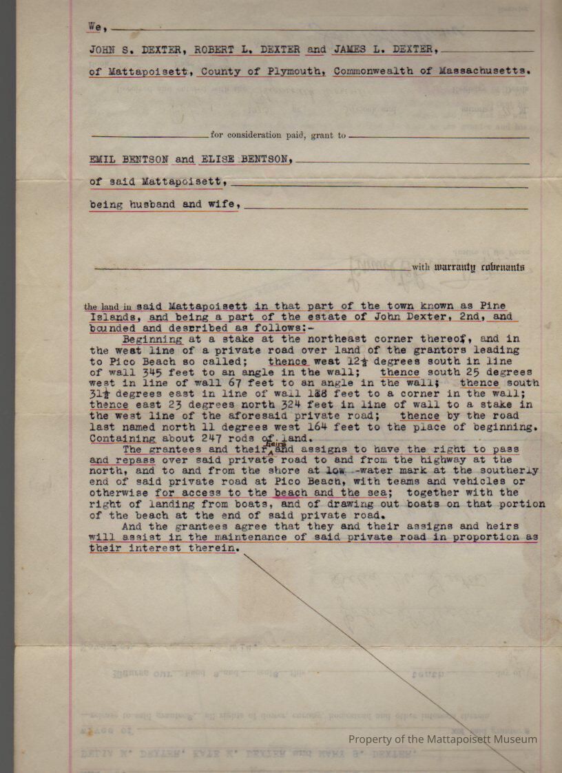 John S. & Delia M. Dexter, Robert L. & Kate M. Dexter and James L. & Mary L. Dexter to Emil & Elise Bentson, land in Mattapoisett at Pine Islands.Collection