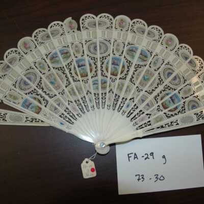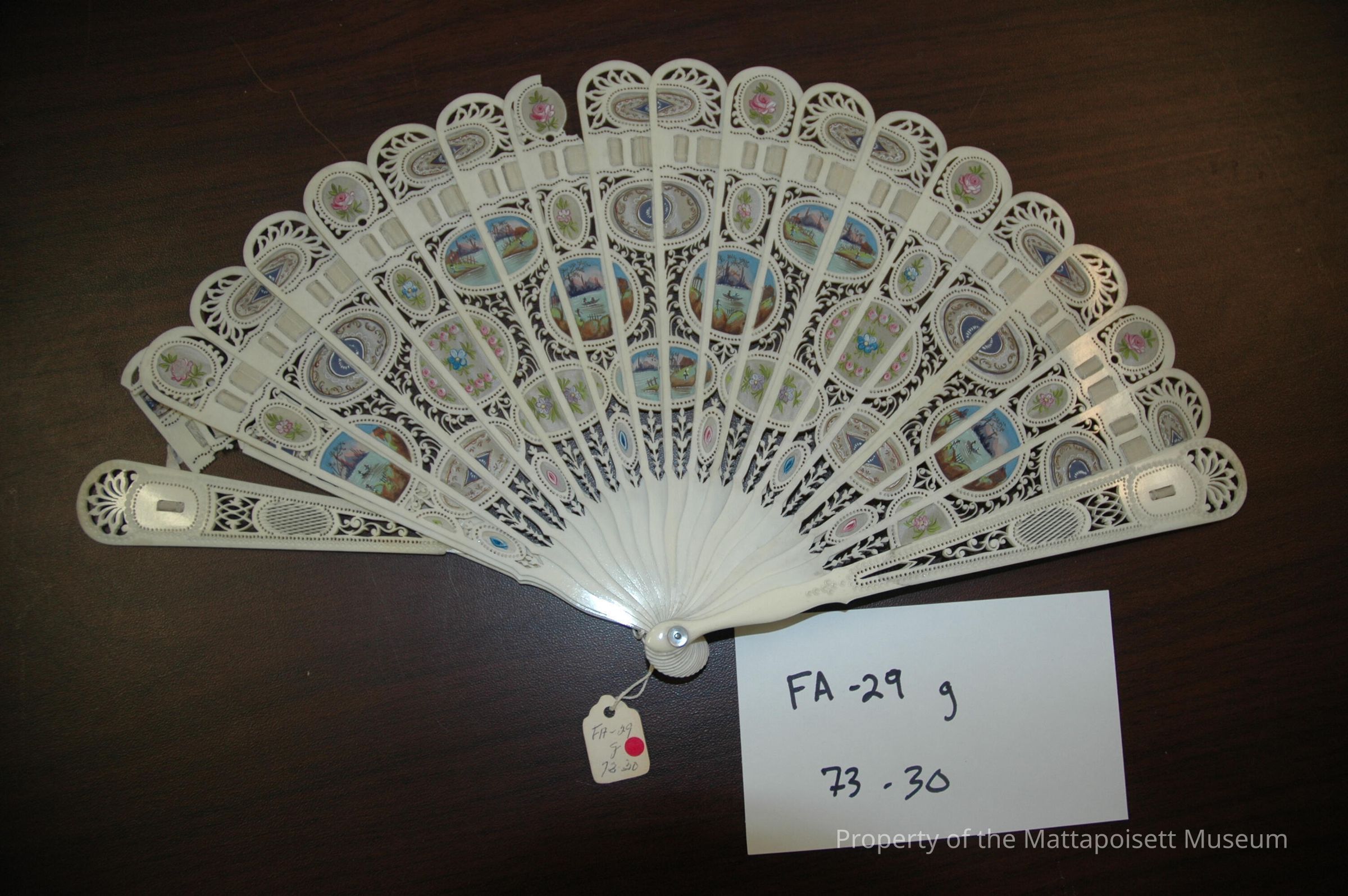 White carved ivory fan with a variety of color scenes inlaid.Collection