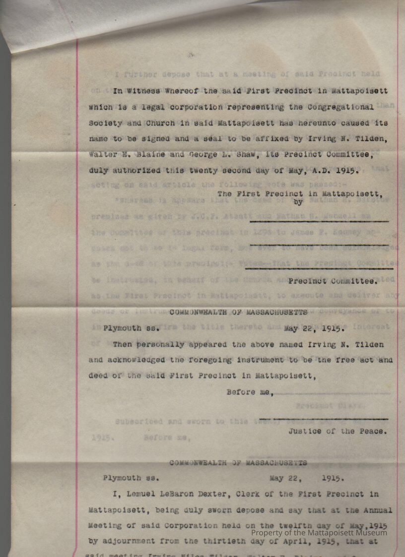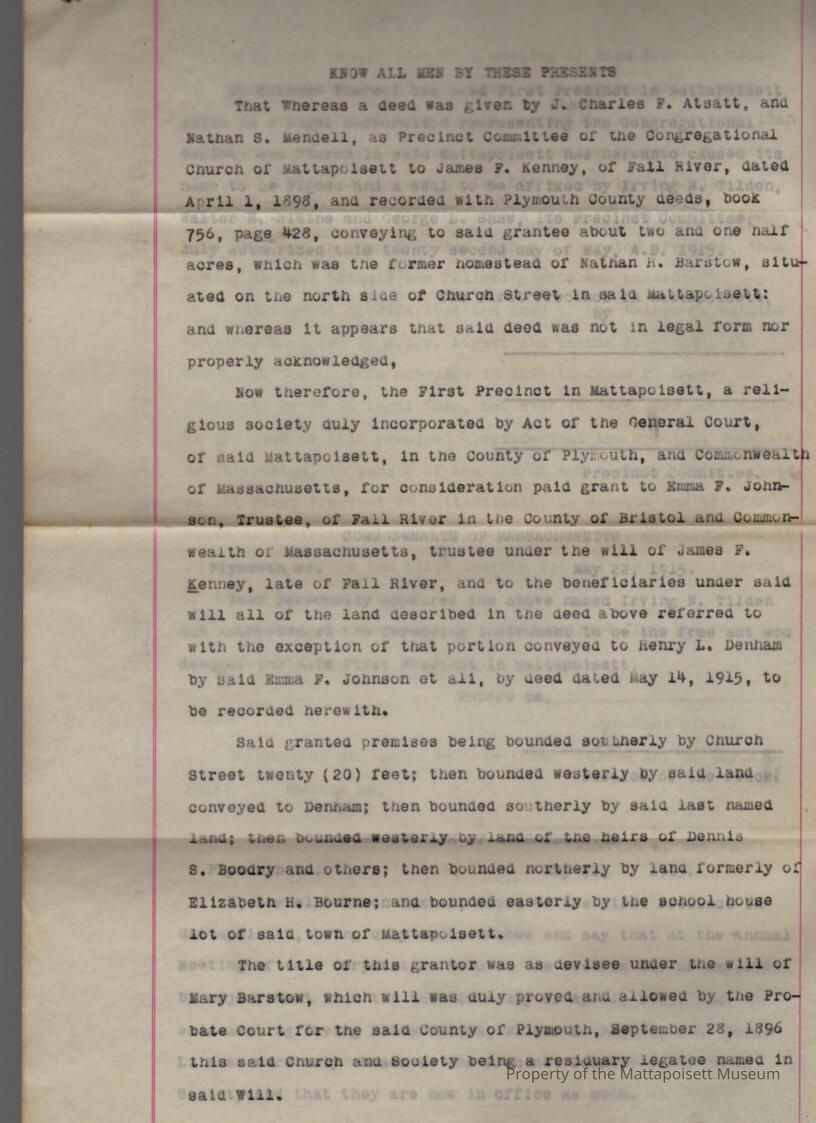 Charles F. Atsatt and Nathan S. Mendell, precinct committee of the Congregational Church, land on the north of Church Street, whereas it appears that said deed was not in legal form nor properly acknowledged, to Emma F. Johnson, trustee of will of James F. Kenney. Unsigned copy.Collection