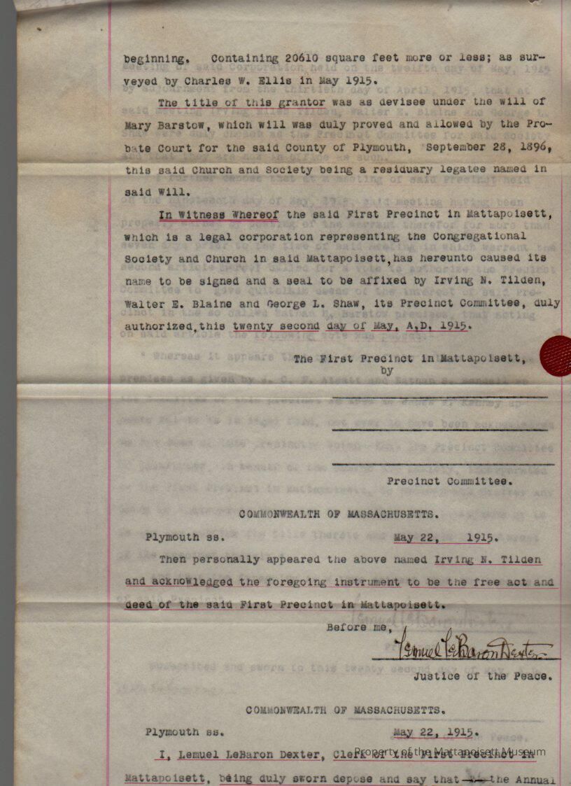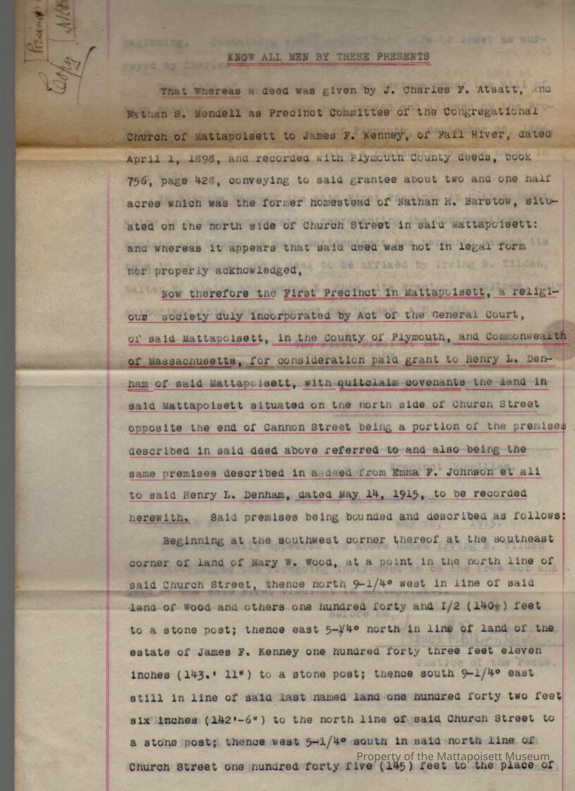 Charles F. Atsatt and Nathan S. Mendell as precinct of the Congregational Church to James F. Kenney of Fall River, original deed not legal nor properly acknowledged, to Henry L. Denham, land on north side of Church Street.Collection