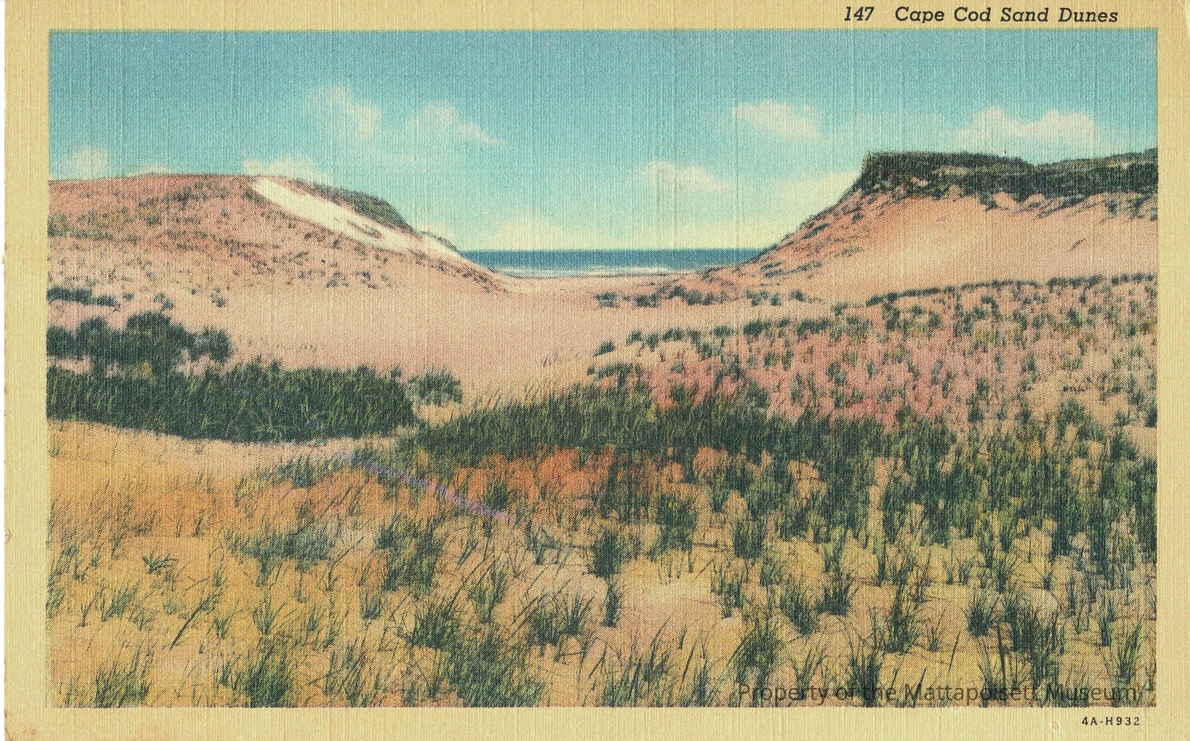 Hand-colored postcard showing Cape Cod Sand Dunes.Collection