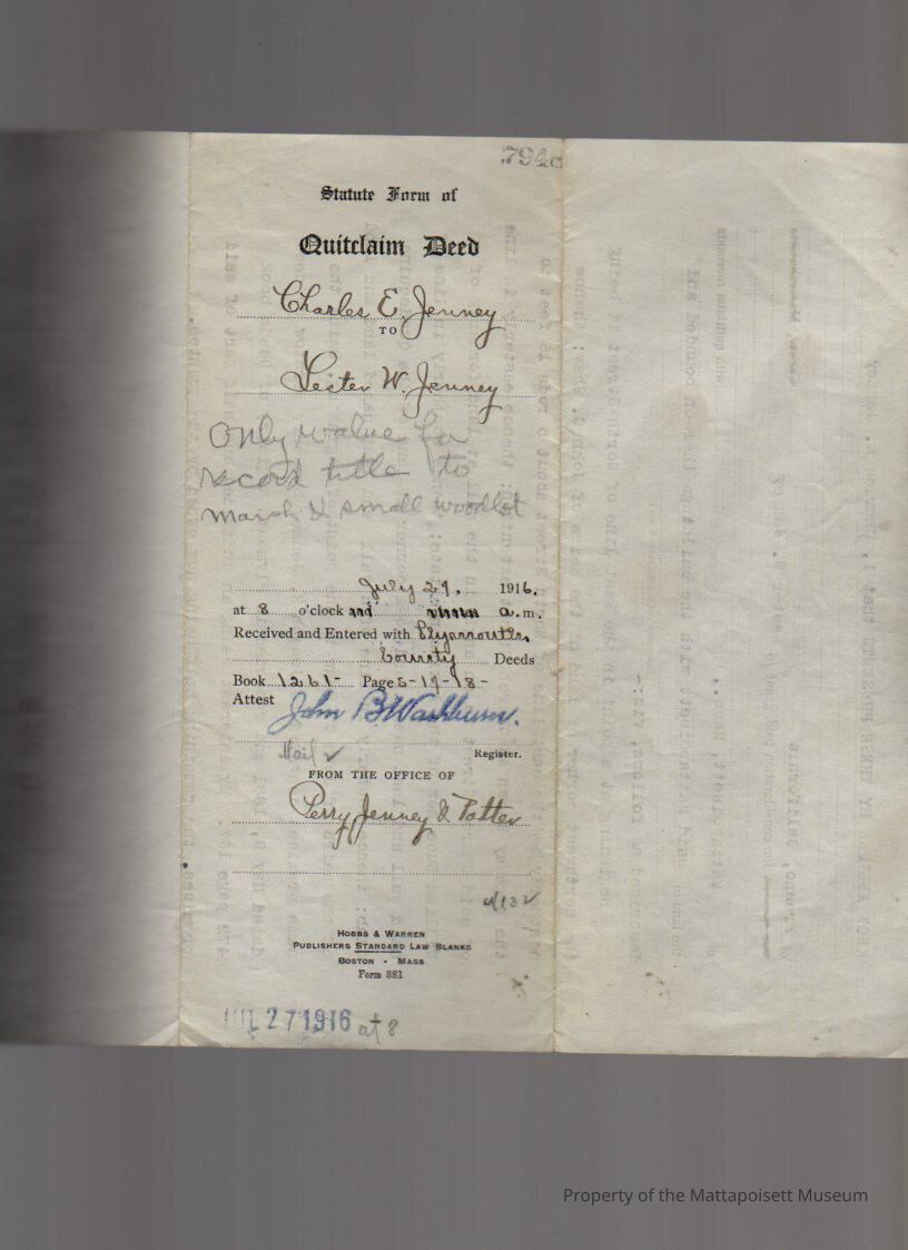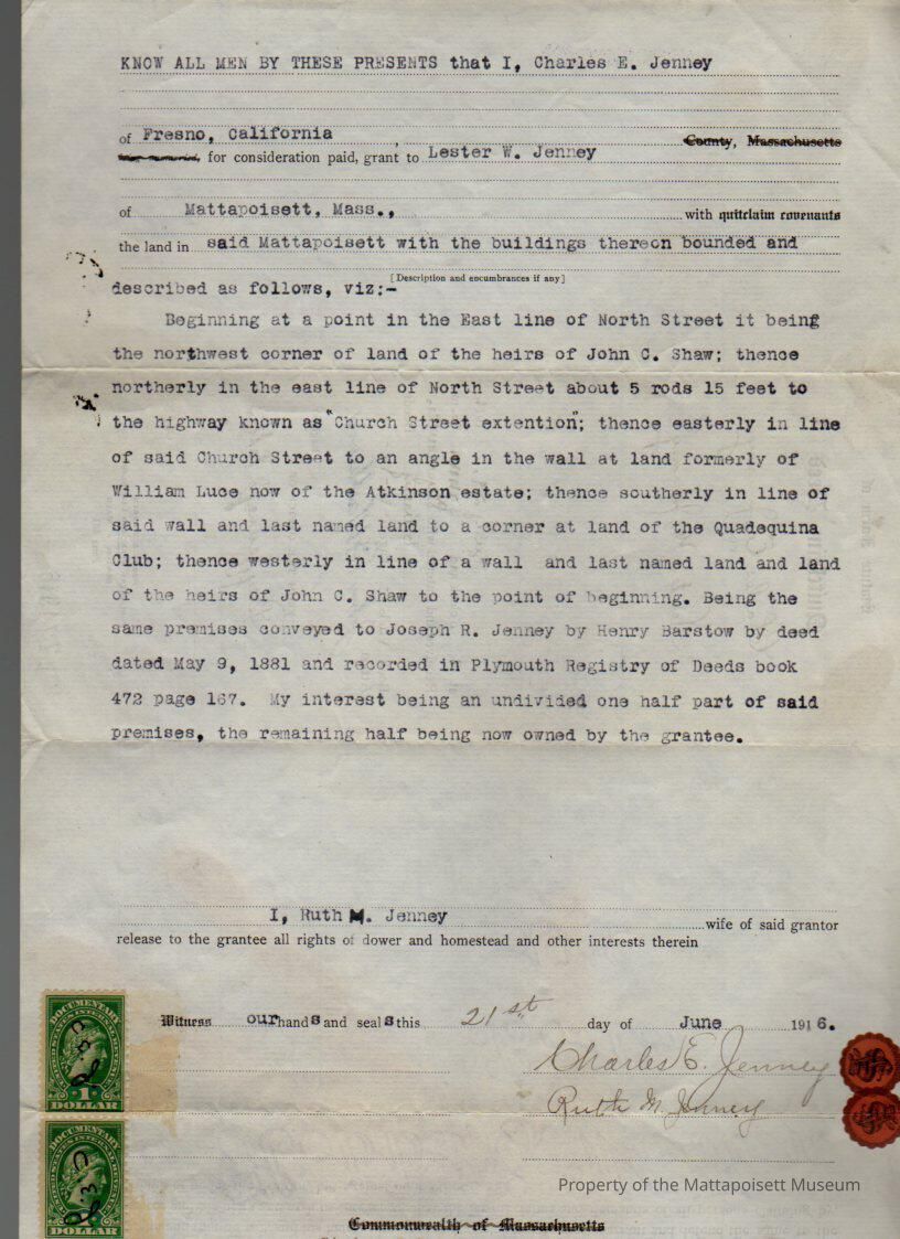 Charles E. & Ruth M. Jenney of Fresno CA to Lester W. Jenney, land and buildings in Mattapoisett.Collection
