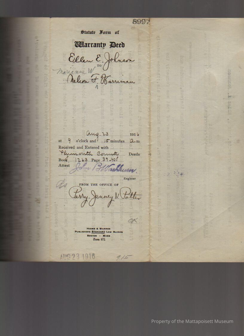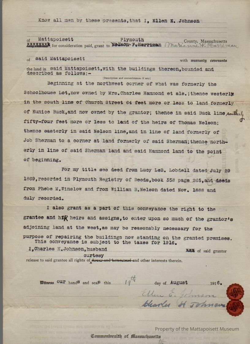Ellen E. & Charles H. Johnson to Marianne W. Harriman, land and buildings in Mattapoisett.Collection