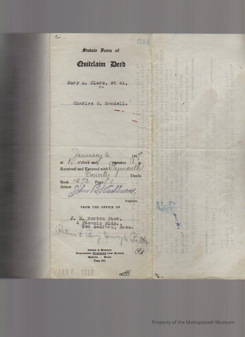 Mary A. Mendell, Mary A. Clark & Ellis L. Mendell, heirs-in-law of Hattie E. Clark to Charles S. Mendell, pew #52 in the Congregational Meeting House.Collection