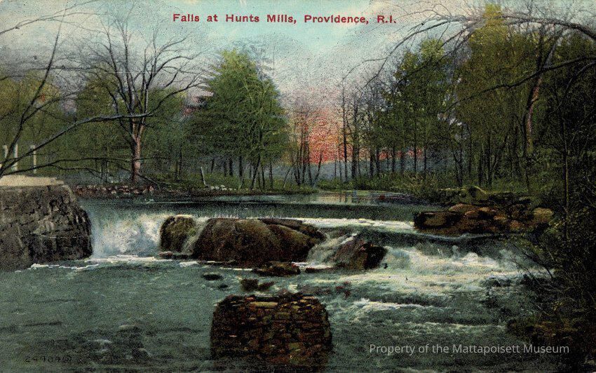 Hand-colored postcard showing Falls at Hunts Mills, Providence, R.I. Handwritten note to Mrs. Olivia H. Purrington, Mattapoisett, Massachusetts. Postmarked April 30, 1912 from New Bedford, Mass.Collection