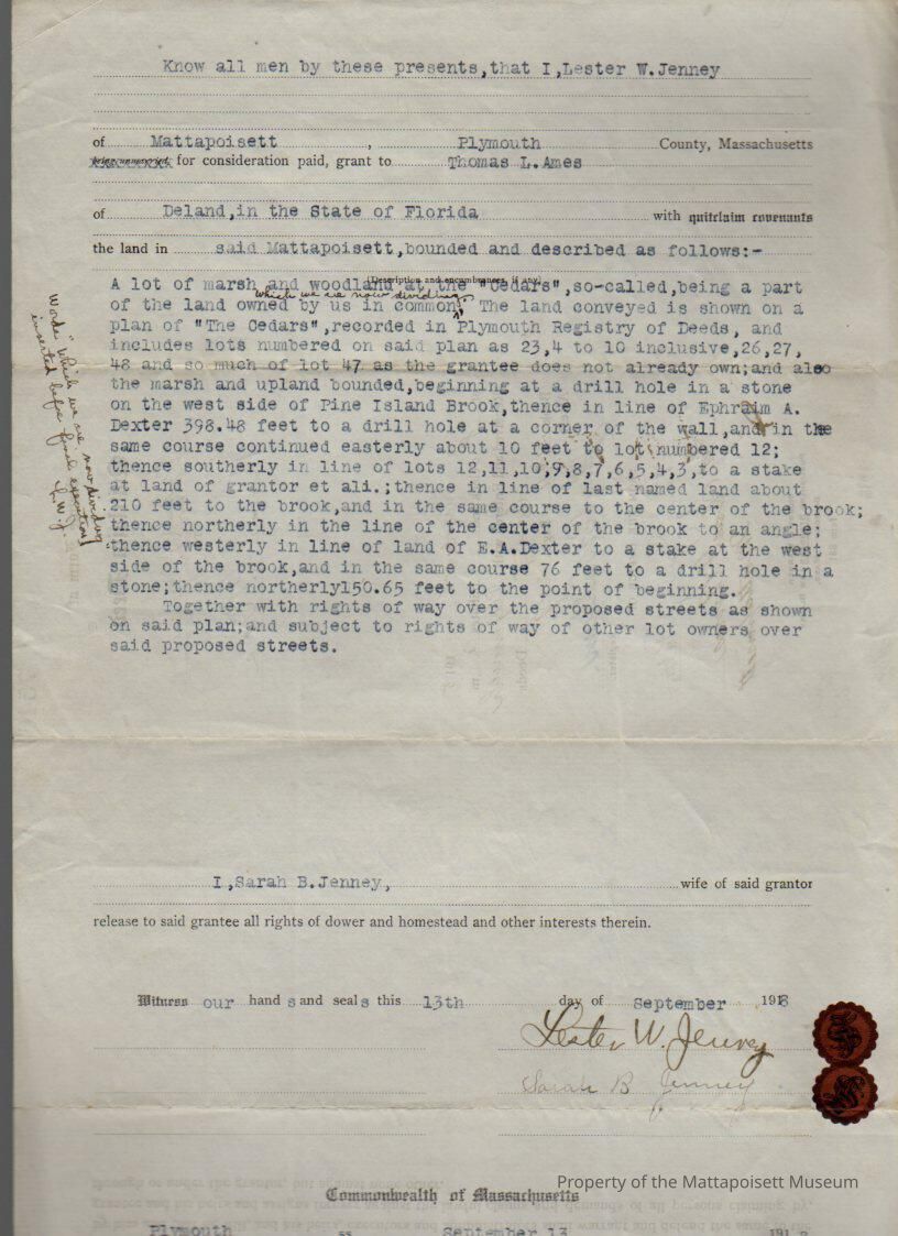 Lester W. & Sarah B. Jenney to Thomas L. Ames, marsh and woodland at the "Cedars".Collection