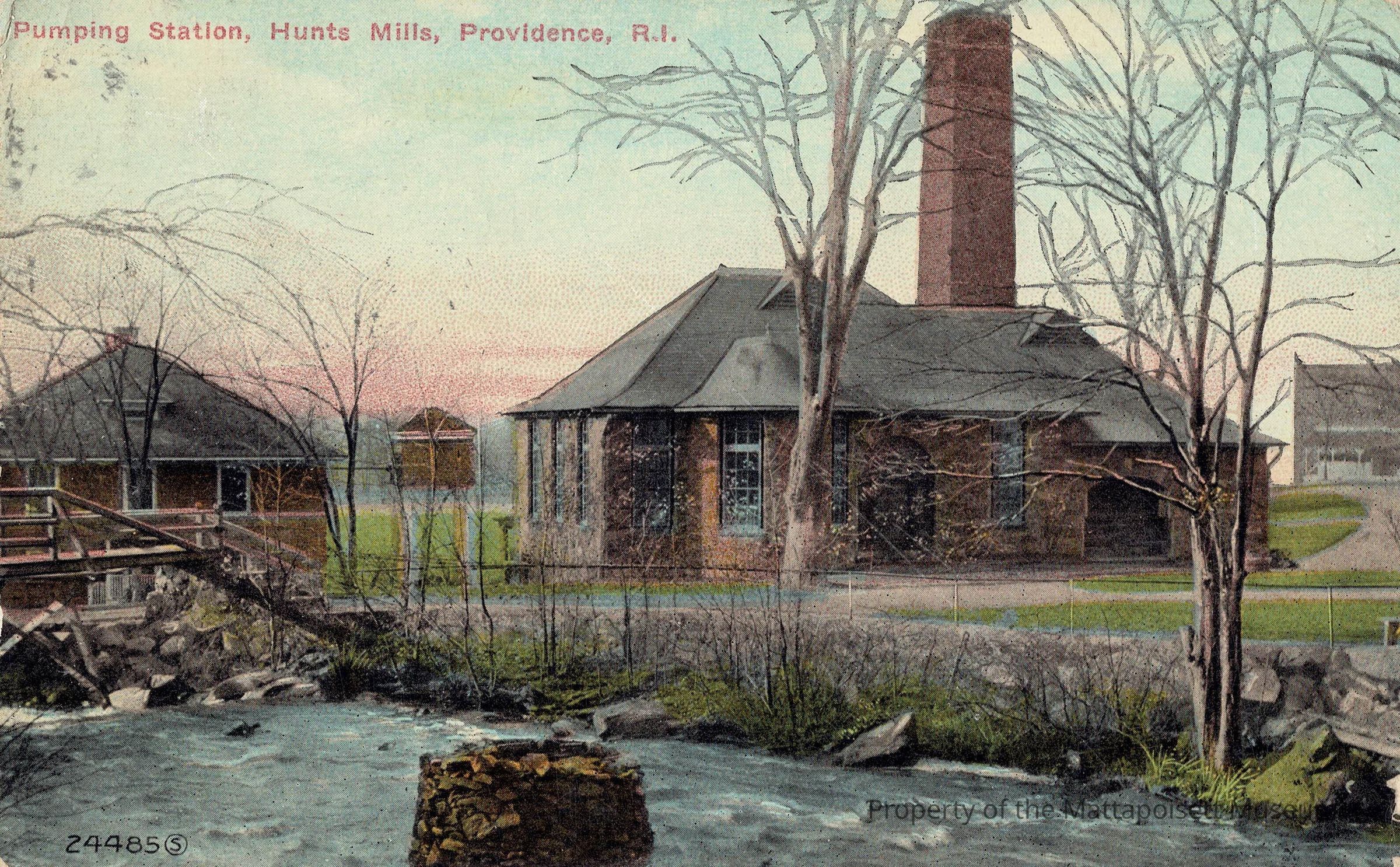 Hand-colored postcard showing Pumping Station, Hunts Mills, Providence, R.I. Hand-written note from Cousin George to Mrs. George Purrington, Jr., Mattapoisett, Mass. Postmarked from New Bedford, Mass. on March 23, 1912.Collection
